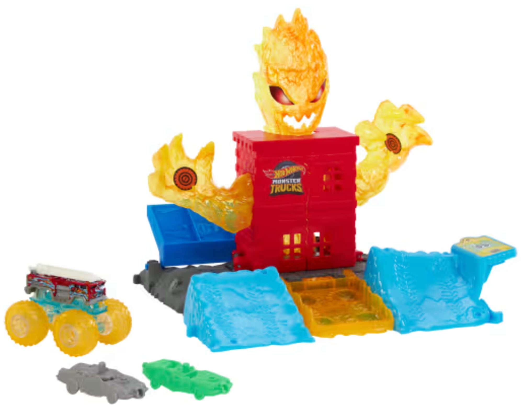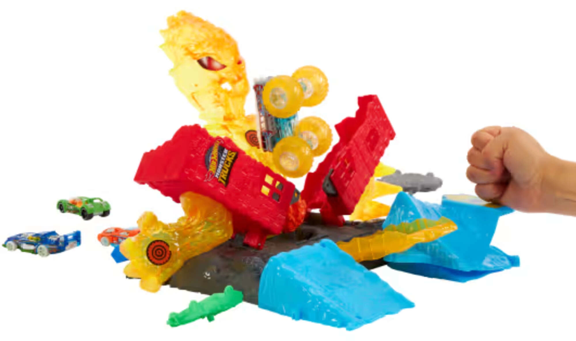 Dominez l’arène avec la tour de feu centrale, le lanceur à ressort et des obstacles interactifs. Chaque tir précis déclenche une explosion spectaculaire, le basculement de portiques ou la chute d’éléments – idéal pour s’exercer à la précision et jouer en compétition avec les amis. Cadeau parfait pour les fans de HOT WHEELS et de monster trucks.