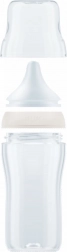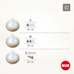 L’indicateur de température NUK entre les graduations fonctionne comme un thermomètre – trop chaud, il devient blanc ; à une température idéale (env. 37 °C), il reste bleu. Le biberon est en polypropylène sans BPA, résistant et incassable, agréable au toucher, avec une prise en main sûre et une base large et stable.
