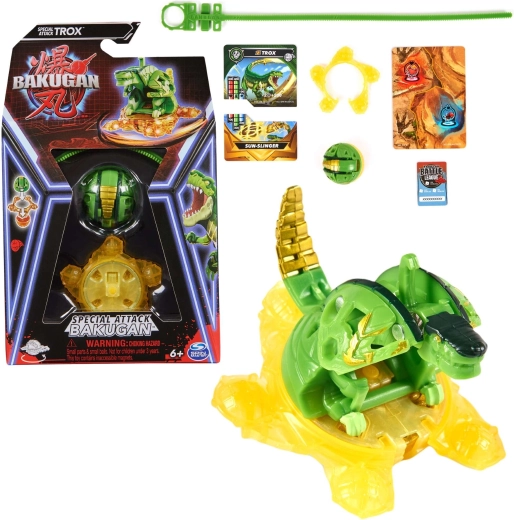 Le coffret Special Attack apporte une nouvelle façon de jouer avec les Bakugan : le mécanisme rotatif garantit des combats dynamiques et des moments de transformation spectaculaires. Le modèle Trox se compose de deux parties Bakugan Top et Bakugan Bottom, entre lesquelles on peut insérer le Power Ring pour encore plus de stabilité et une rotation encore plus marquée.