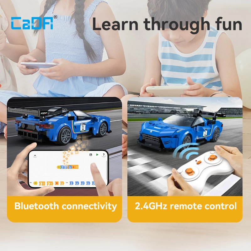 Grâce au Dual Mode, vous pouvez piloter la voiture soit avec la télécommande 2,4 GHz incluse, soit confortablement via l’application Bluetooth (Android/iOS) avec une portée d’environ 25 mètres. Le modèle atteint une vitesse allant jusqu’à 3,6 km/h, est compatible avec d’autres sets CaDA et développe parfaitement la dextérité manuelle, la créativité et la pensée technique.