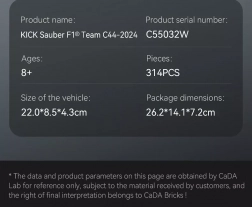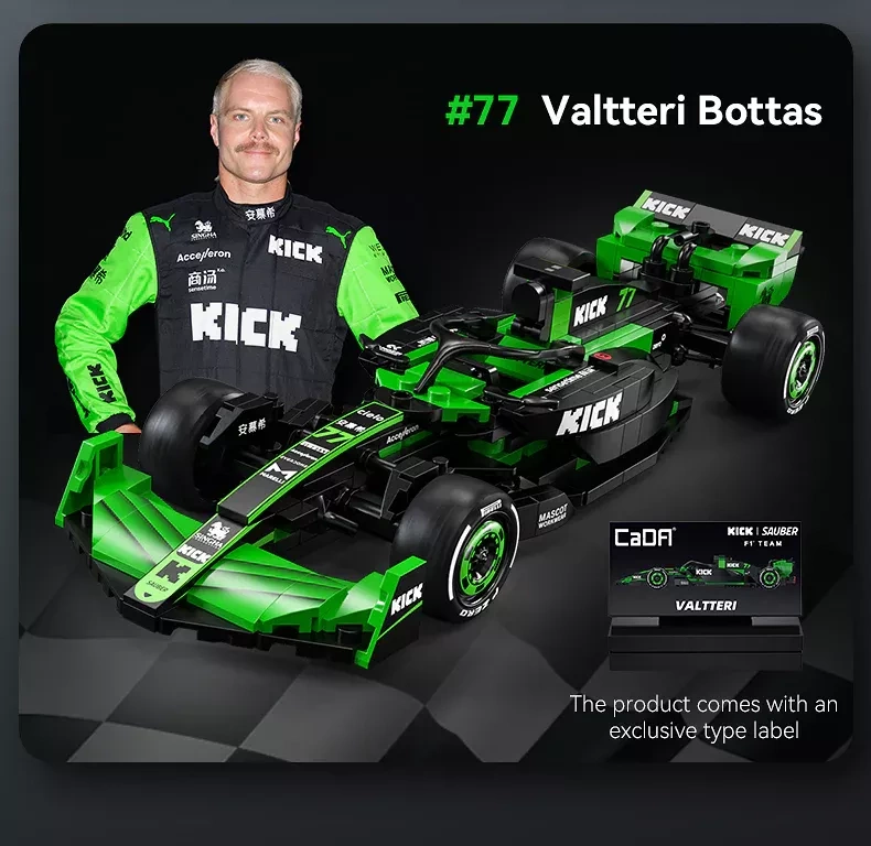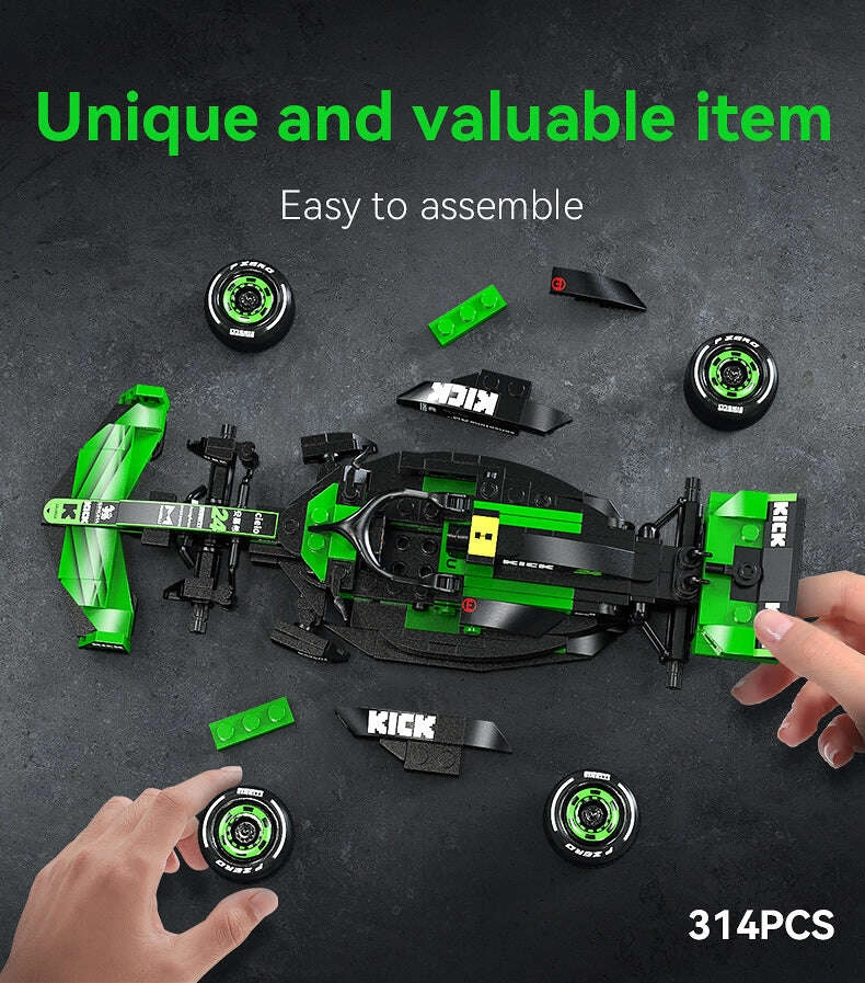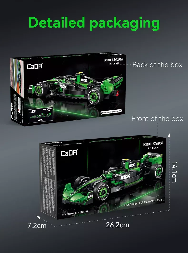 Construisez un modèle détaillé de la voiture de course F1 KICK SAUBER à l’échelle 1:24 de la marque CaDA. Le set contient 314 pièces avec des impressions durables sans autocollants et permet de choisir le numéro de voiture 24 (Zhou) ou 77 (Bottas). Des détails réalistes comme le système Halo, les rétroviseurs, le volant et les pneus Pirelli avec logo raviront les enfants comme les collectionneurs adultes.