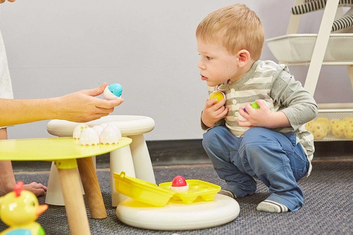 Ce jouet éducatif apprécié de la marque TOMY associe plaisir de la découverte et apprentissage. Les enfants adorent ouvrir et fermer les coquilles, presser les poussins qui couinent et surtout associer les formes des œufs aux bonnes positions dans la boîte. Sa fabrication robuste, des matériaux sûrs et la boîte compacte à fermeture permettent d’emporter le jouet facilement en voyage.