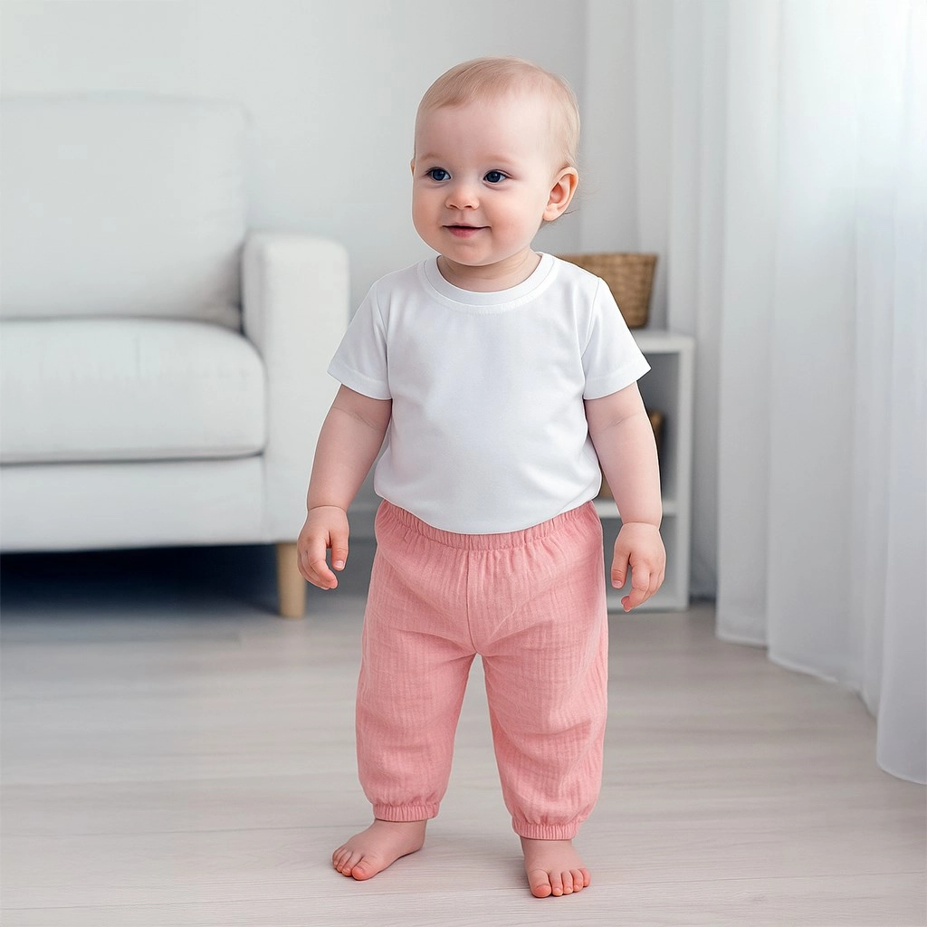 Cet ensemble pour enfants allie confort maximal et praticité. Le t-shirt en coton est doux, respirant et, grâce au bord-côte délicat à l’encolure, ne comprime pas même en cas de port prolongé. Le pantalon en mousseline est léger, résistant et agréable au toucher – idéal pour les enfants actifs.