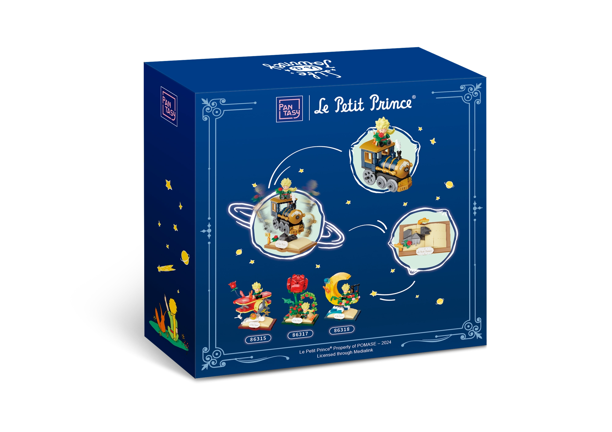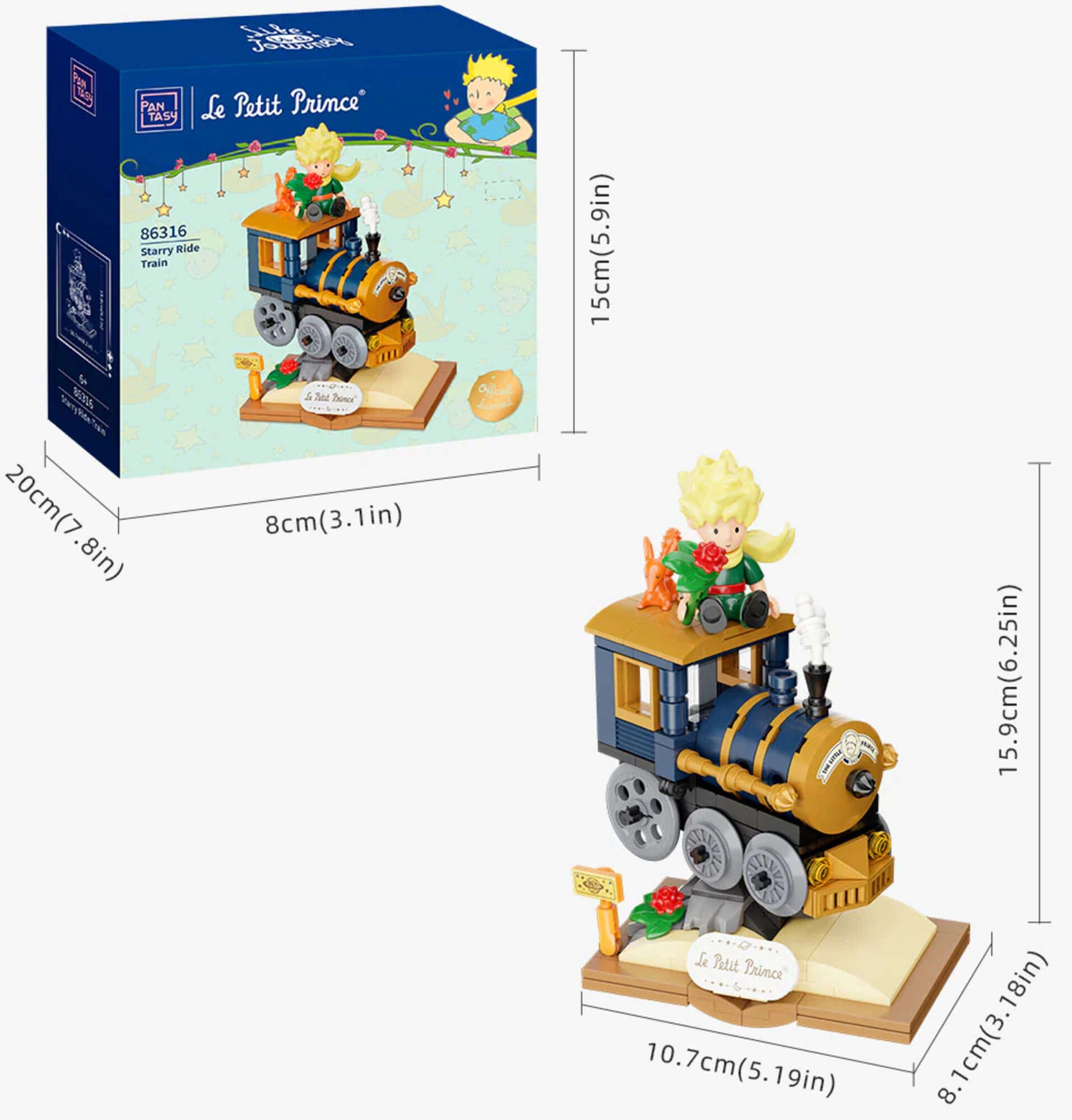 Ce kit de la collection Pantasy – Starry Ride Series vous plonge dans l’univers poétique du Petit Prince. Le petit train élégant, dans des tons or, bleu marine et noir, est placé sur un socle évoquant un livre ouvert portant l’inscription « Le Petit Prince ». On y retrouve des détails symboliques comme la rose, les étoiles, de petits nuages et la figurine du Petit Prince avec le renard.