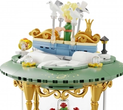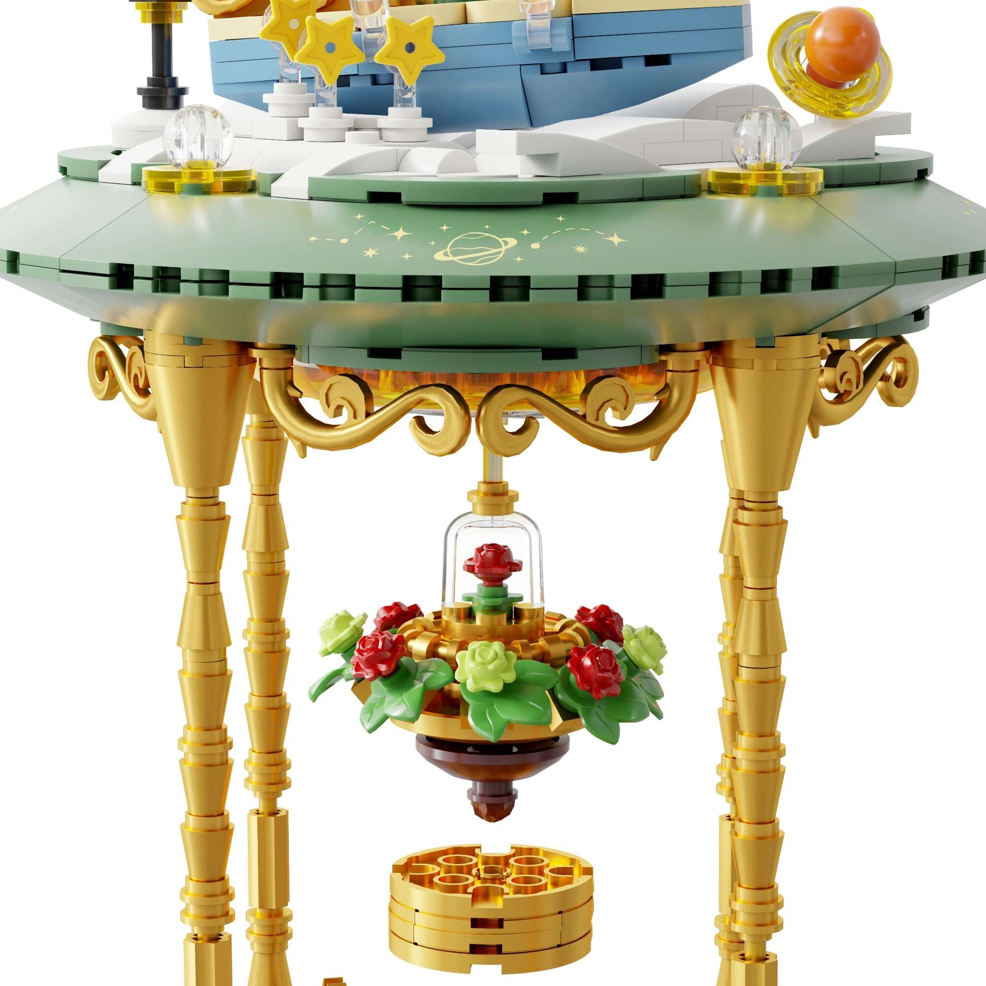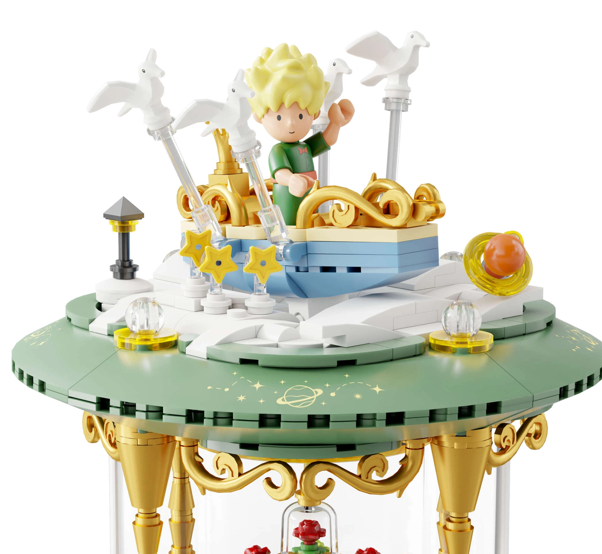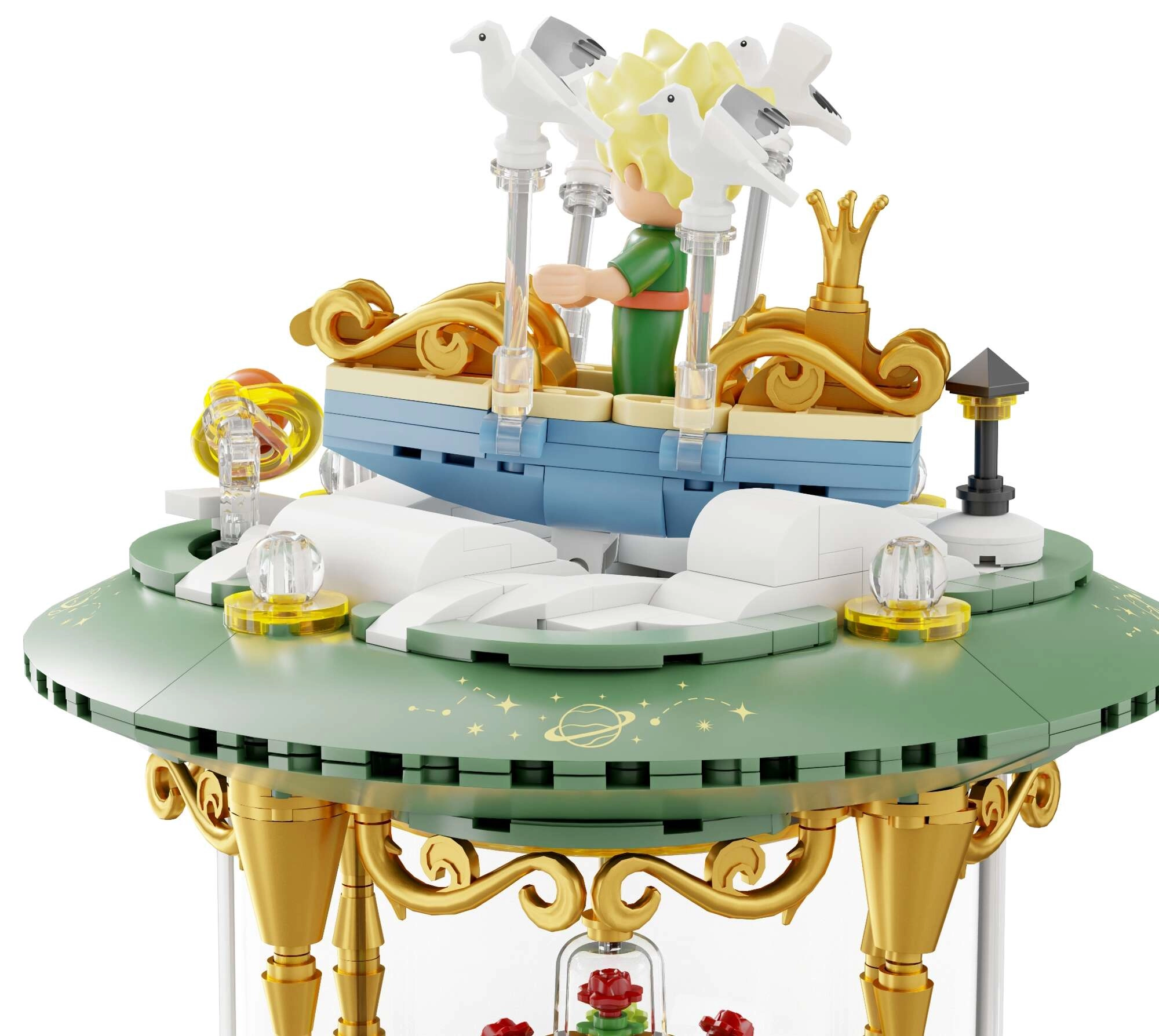 Ce set d’exposition en forme de sablier élégant marie la poésie d’une œuvre intemporelle à un design moderne. Des socles verts, des colonnes dorées et des chambres transparentes avec mini-scènes créent un diorama spectaculaire – le Petit Prince, le renard, la rose sous cloche et le ciel étoilé. Grâce à l’ajustement précis des briques et aux motifs imprimés, le modèle conserve une apparence impeccable pendant de nombreuses années.