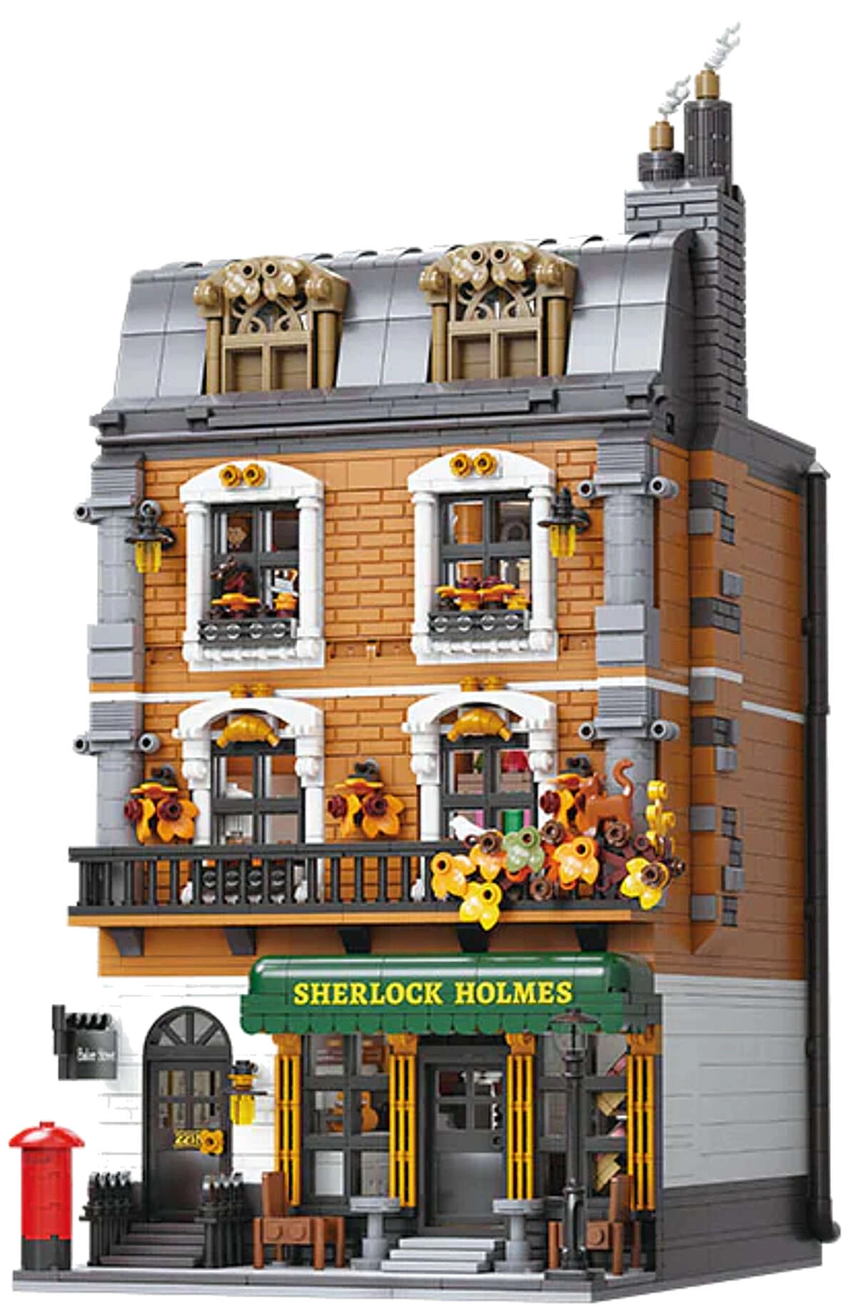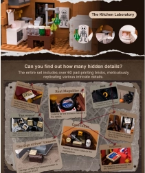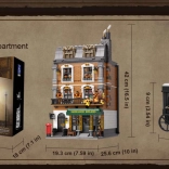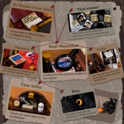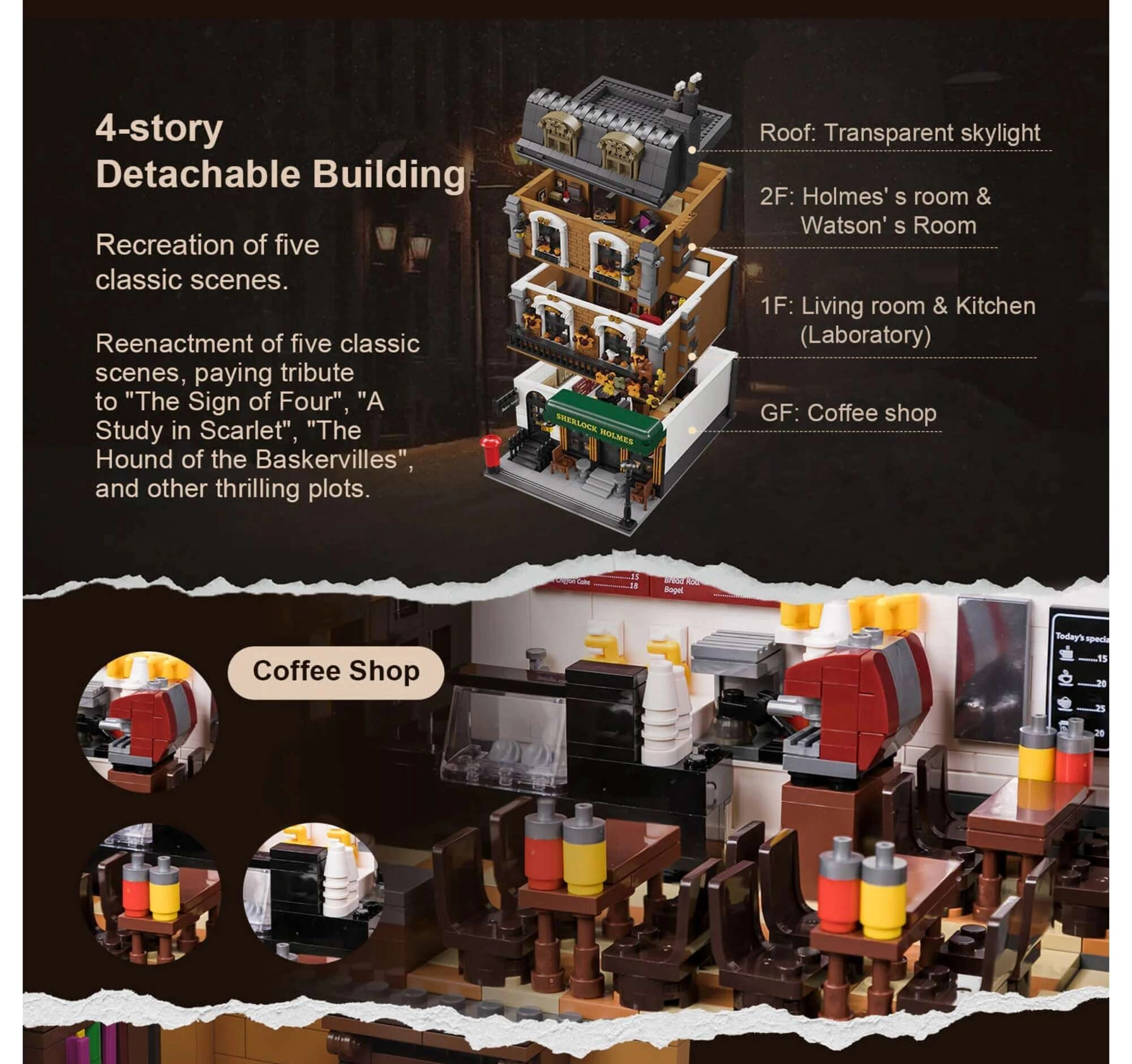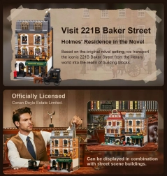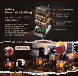 Le modèle de maison de ville à quatre étages restitue fidèlement l’atmosphère du Londres victorien. Vous y trouverez un salon douillet avec bibliothèques, un bar-café 221B, la chambre de Holmes avec journaux et violoncelle ainsi qu’un bureau rempli d’artefacts. Grâce à plus de 60 briques spécialement imprimées avec des motifs de Londres, de Watson et des cartes, profitez d’une authenticité maximale sans recourir aux autocollants.