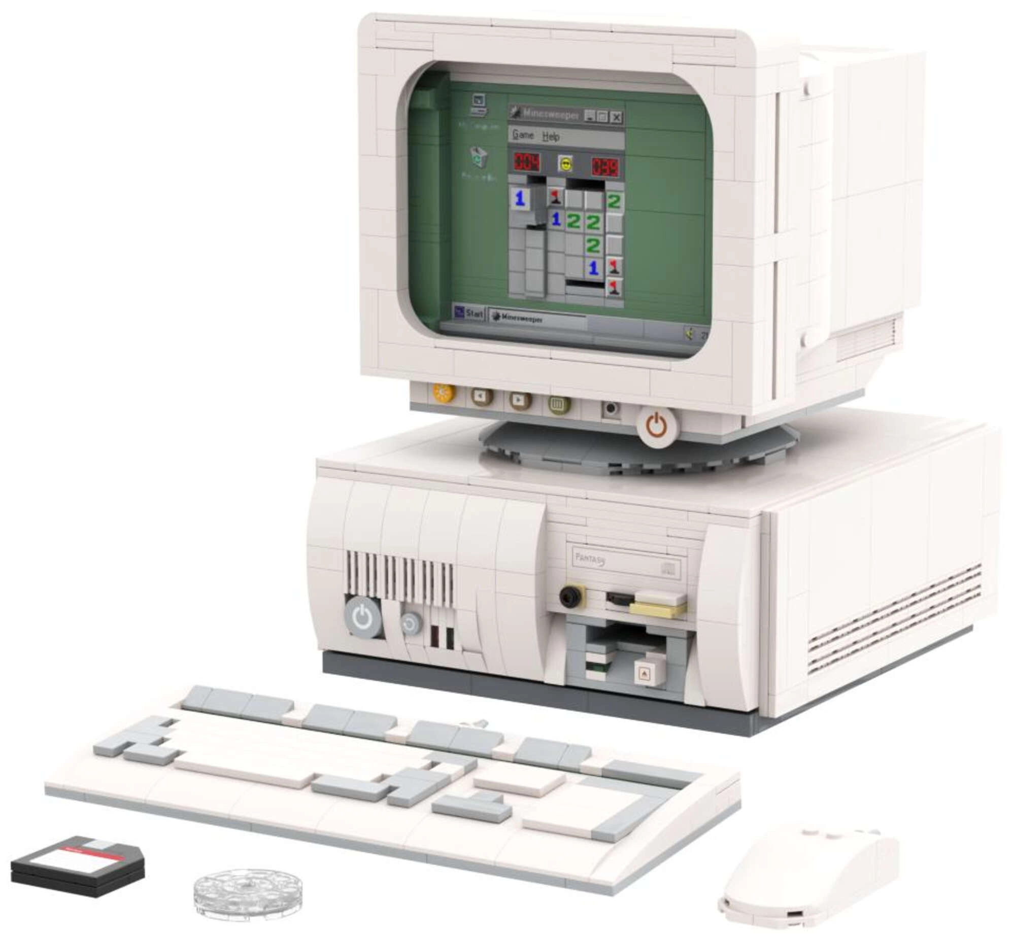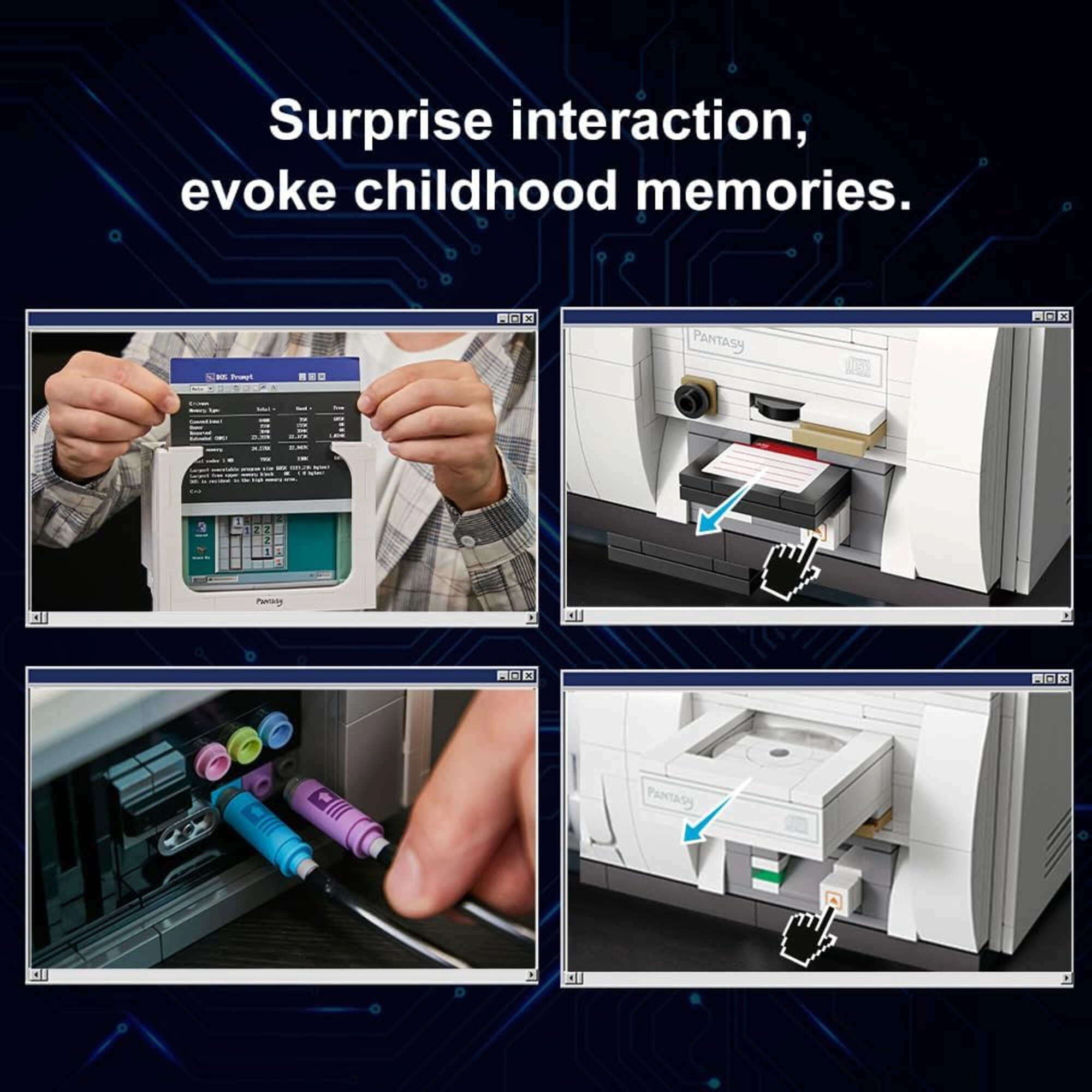 Le modèle inclut un moniteur, une unité système, un clavier, une souris, des disquettes et un CD. Grâce aux fonctions interactives et aux cartes d’écran recto-verso, vous pouvez changer la scène affichée et créer vos propres compositions d’exposition. Sont également inclus un tapis de souris rétro et des compartiments cachés pratiques.