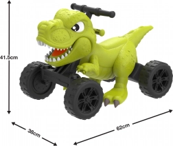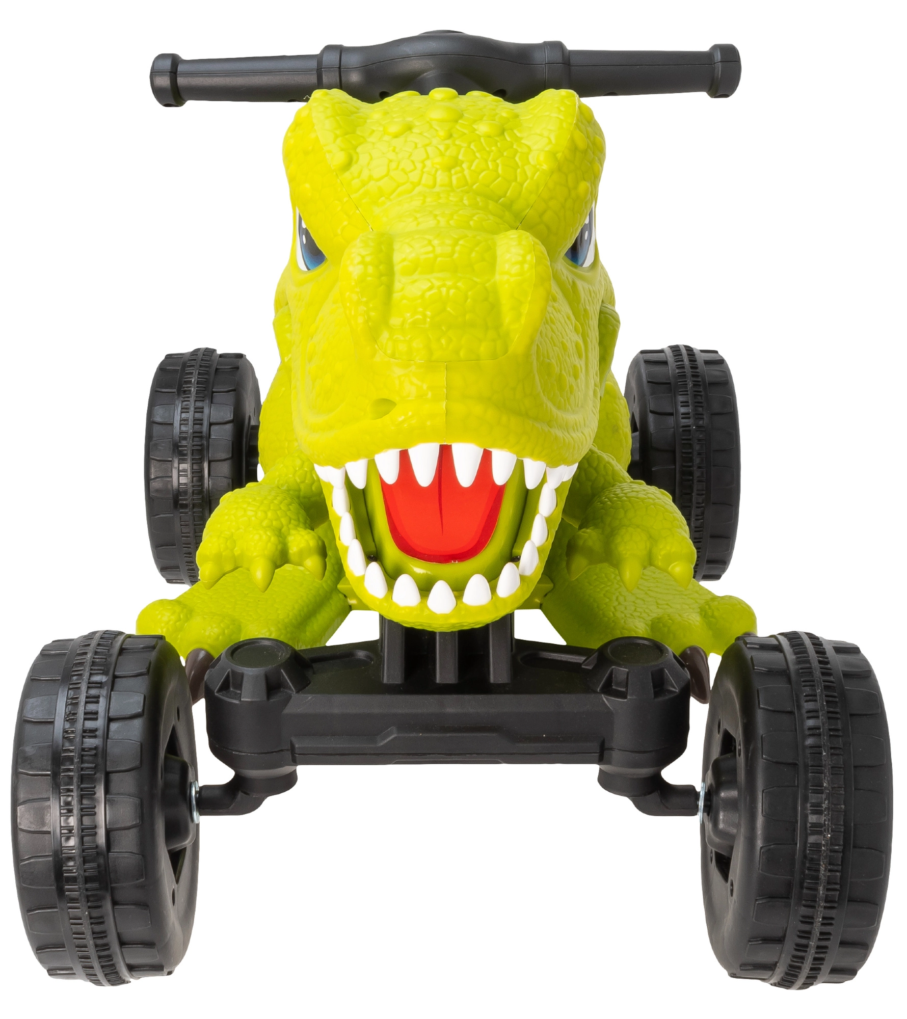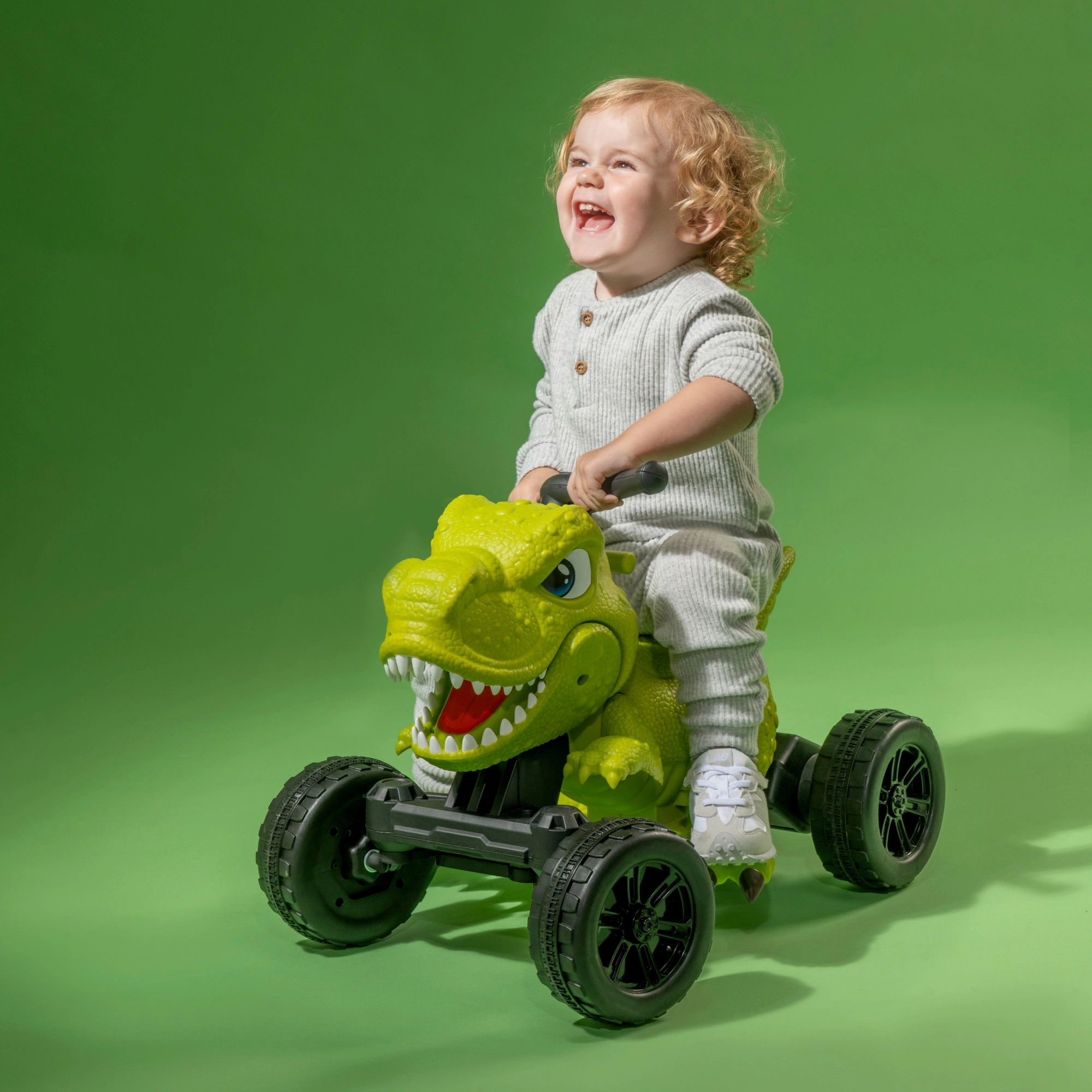 La commande simple permet une progression fluide jusqu’à 3 km/h. Des roues larges et des marchepieds antidérapants améliorent la stabilité, tandis que le son du dinosaure et la mâchoire mobile activée par la poignée favorisent le jeu interactif. La couleur vert vif attire en plus l’attention des petits conducteurs.