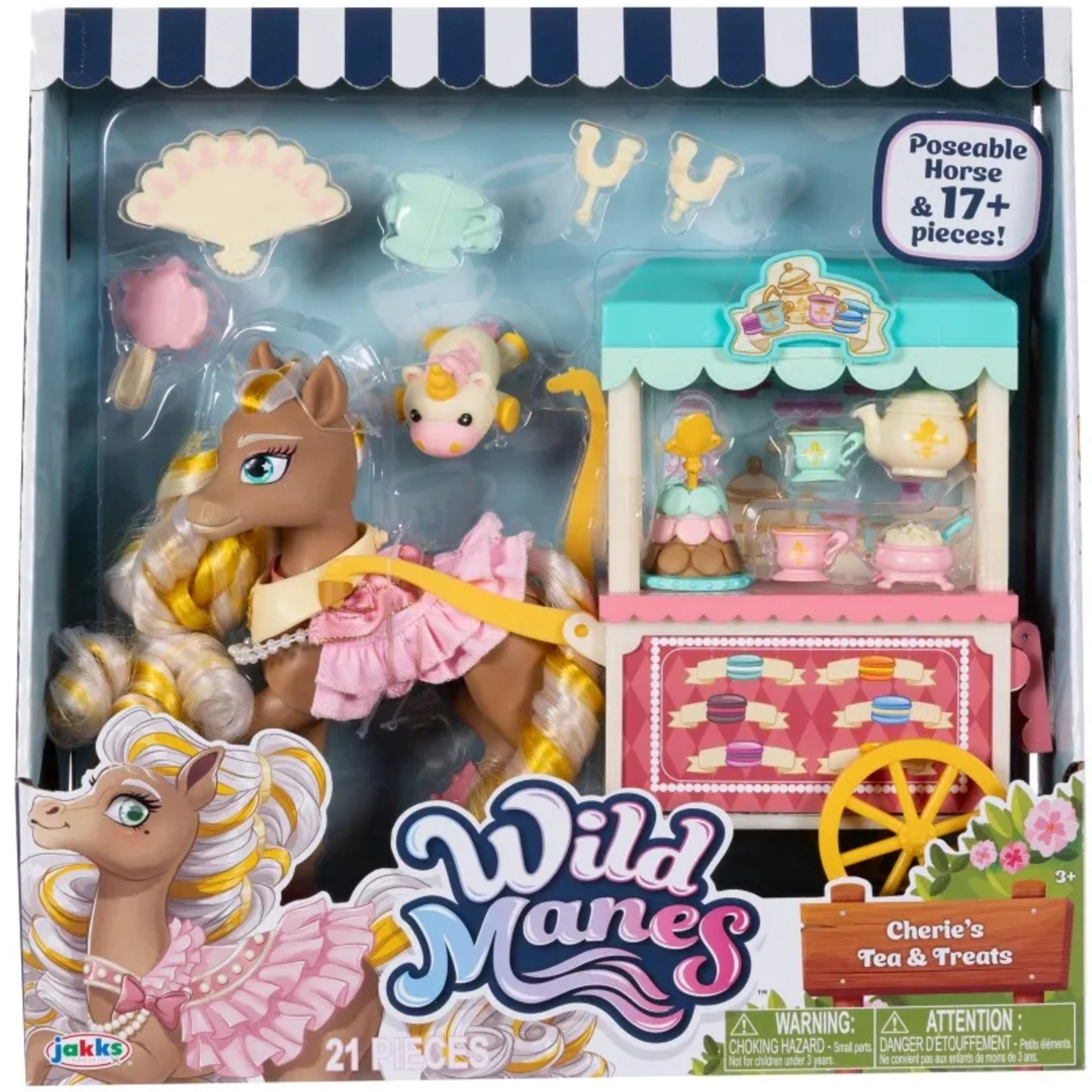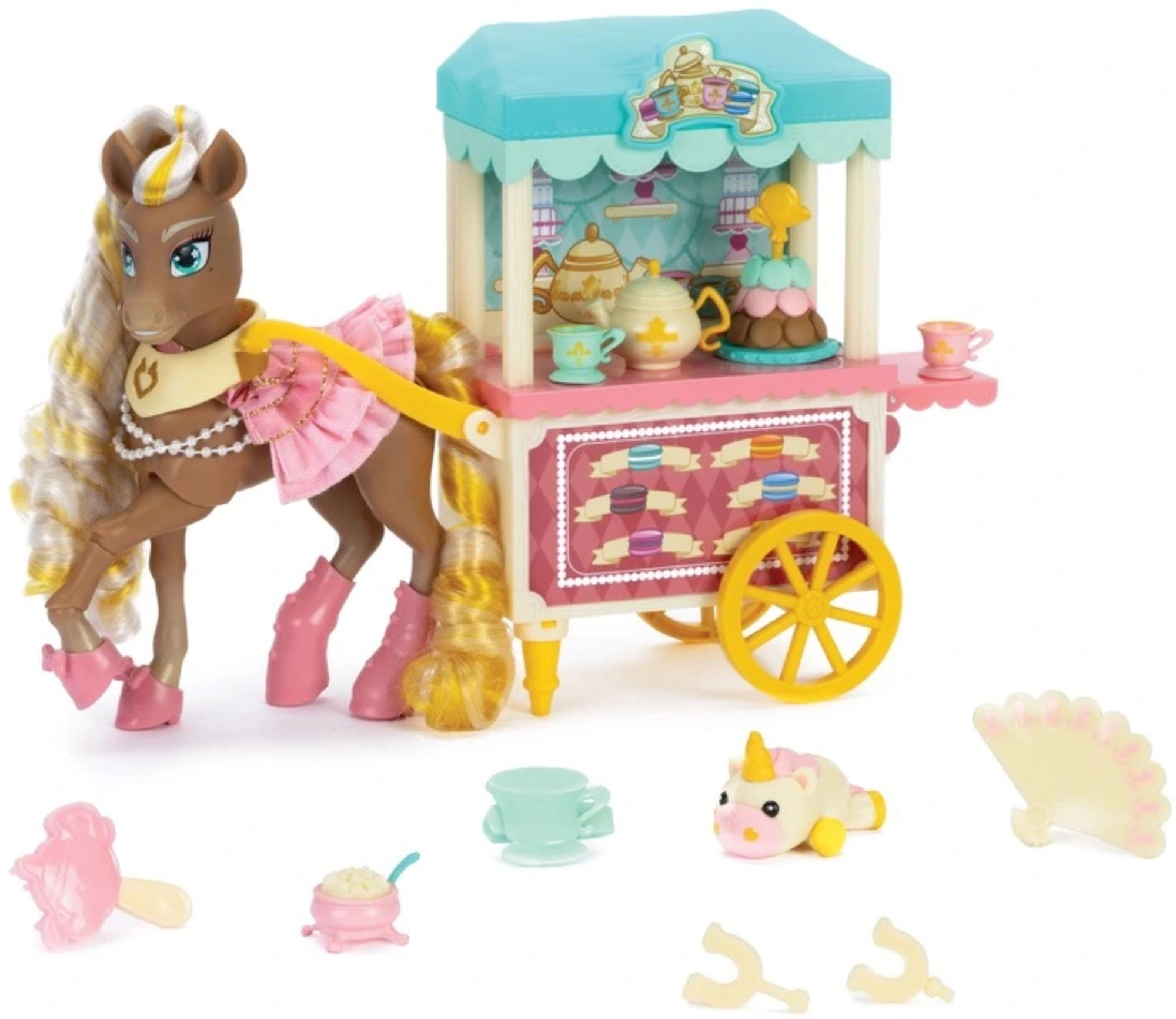 Le set comprend un grand chariot Tea & Treats avec deux roues mobiles, une théière avec thé, des tasses, des macarons sur présentoir et d’autres petits accessoires adorables. Le chariot peut être attaché au poney à l’aide de l’anneau d’attelage pour partir s’amuser. Grâce aux pinces en forme de fer à cheval, Cherie peut tenir fermement certains accessoires.