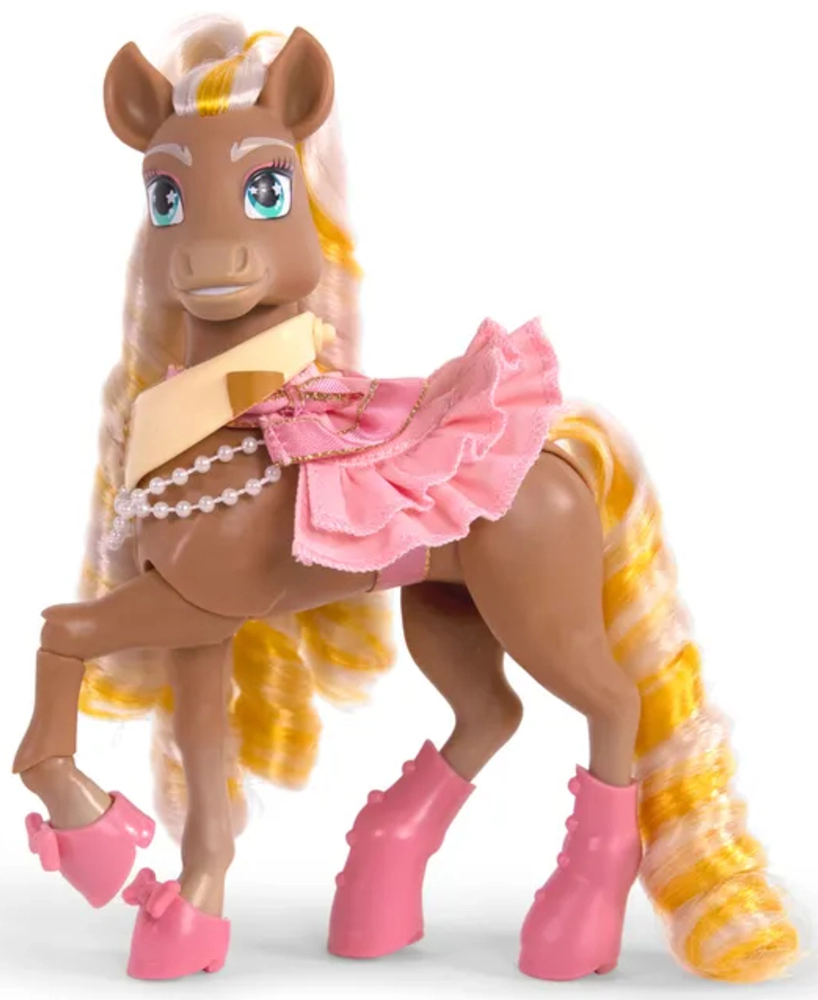 Poney avec membres articulés, longue crinière aux mèches dorées et capacité de tenir les accessoires grâce aux pinces en forme de fer à cheval.