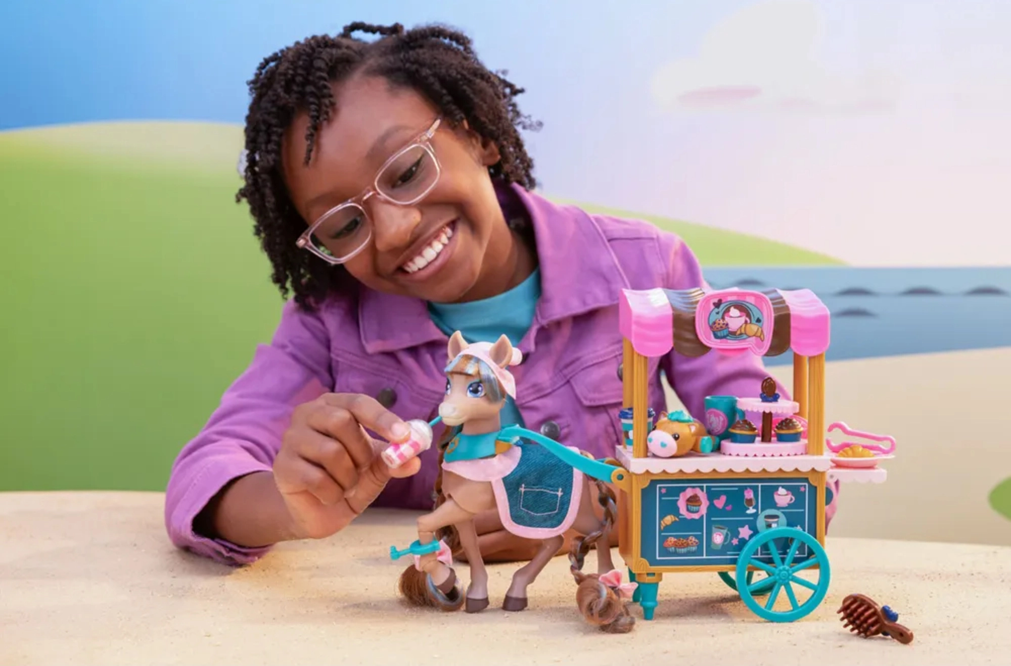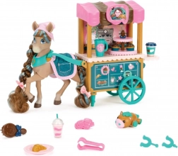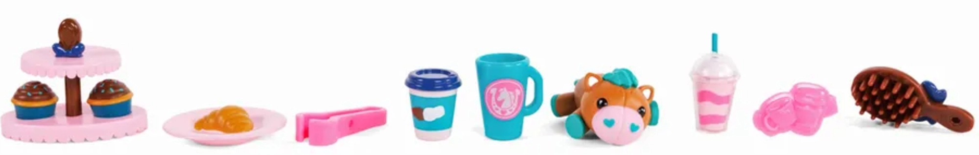 Le coffret comprend des pâtisseries, des boissons, une brosse, un présentoir à cupcakes et un adorable petit compagnon – tout pour des heures de jeu et de soin du poney.