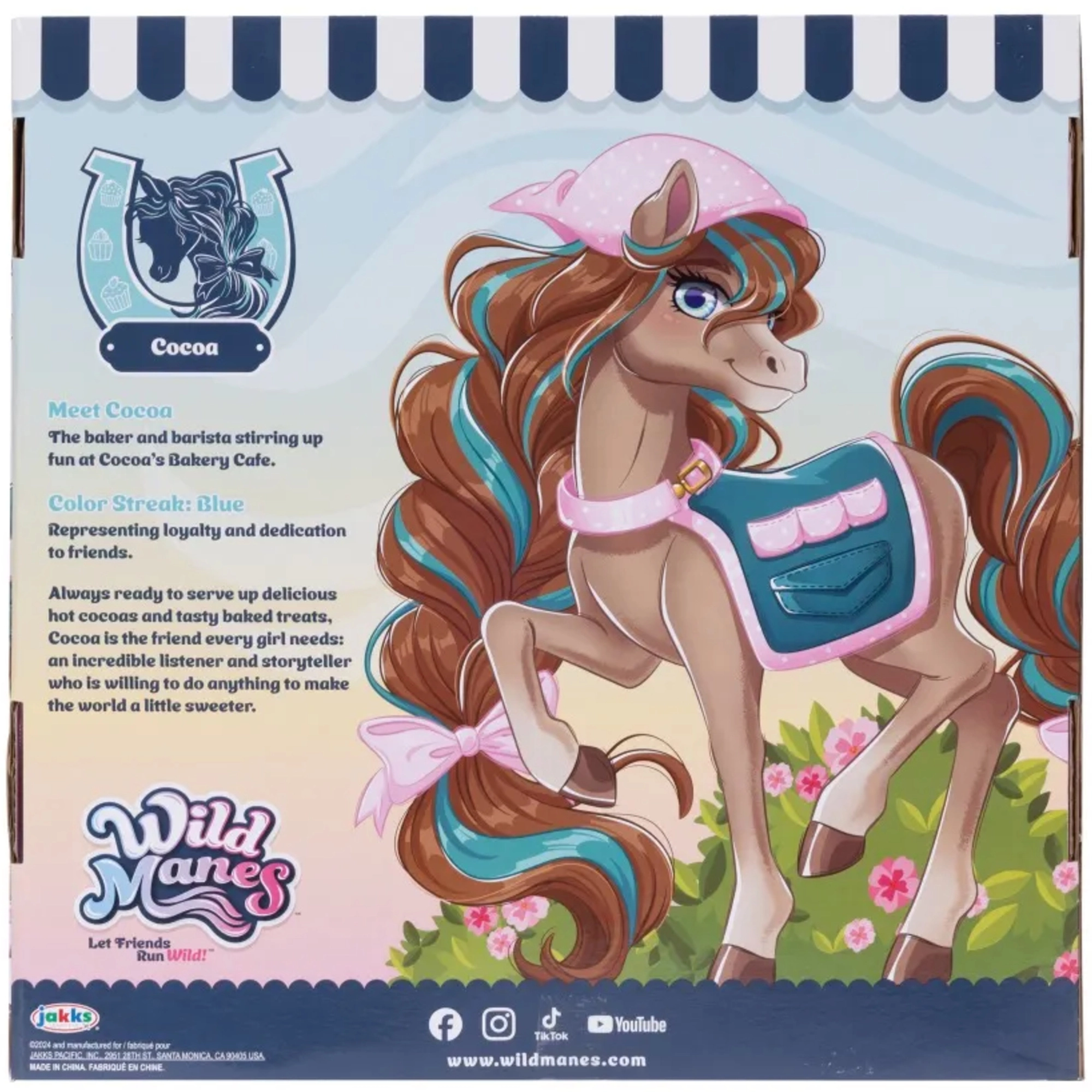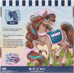 Le poney Cocoa de la série populaire WILD MANES arrive avec un chariot détaillé Bakery Café, où il peut servir boissons et pâtisseries. La figurine possède une crinière finement travaillée avec des tresses, de grands yeux expressifs et porte un tablier stylé – prête pour chaque aventure. Grâce aux clips en forme de fer à cheval, Cocoa peut tenir des accessoires et jouer facilement différentes scènes.