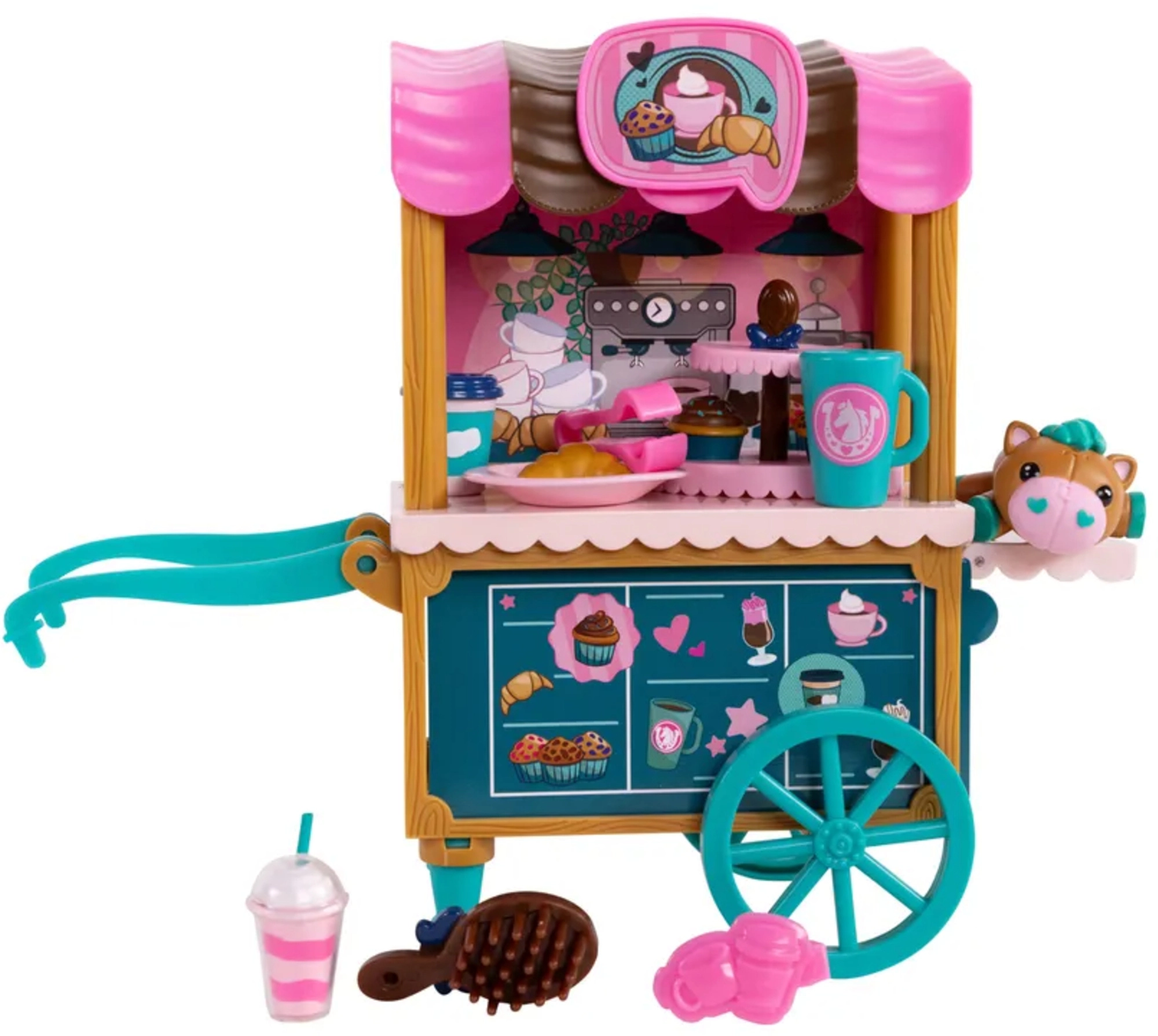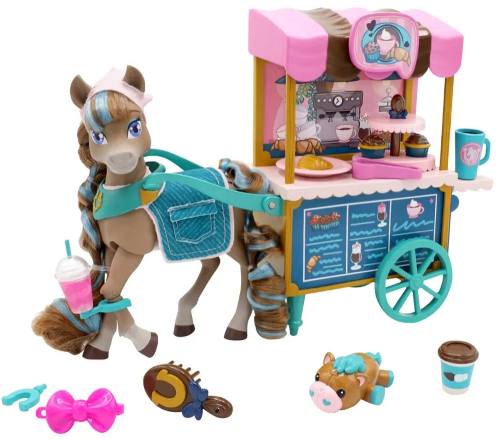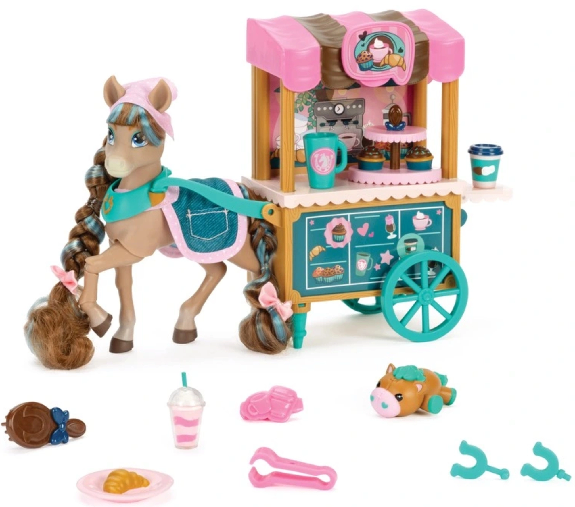 Le chariot dispose de roues pivotantes, d’une poignée et d’étagères pour les douceurs, d’un auvent coloré et d’un graphisme de café. Le set inclut également des accessoires de service et de pâtisserie, un petit compagnon et une brosse pour coiffer la crinière. Tout est conçu pour un jeu de rôle créatif, le développement de la motricité fine et des interactions sociales.