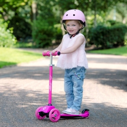 Les grandes roues avant et le plateau bas offrent assurance et stabilité sur surfaces planes. Les poignées en caoutchouc sont agréables en main, le frein arrière sur garde-boue stoppe en toute fiabilité et les roulements ABEC-5 garantissent une conduite silencieuse et fluide. Le réglage en hauteur du guidon en T s’adapte facilement à la taille actuelle de l’enfant.