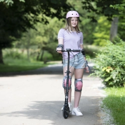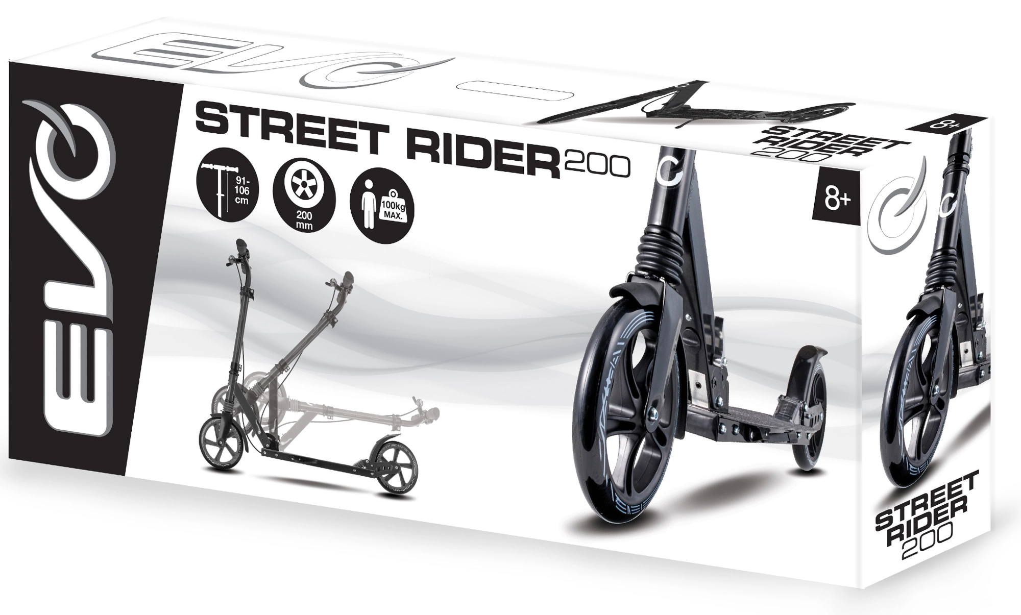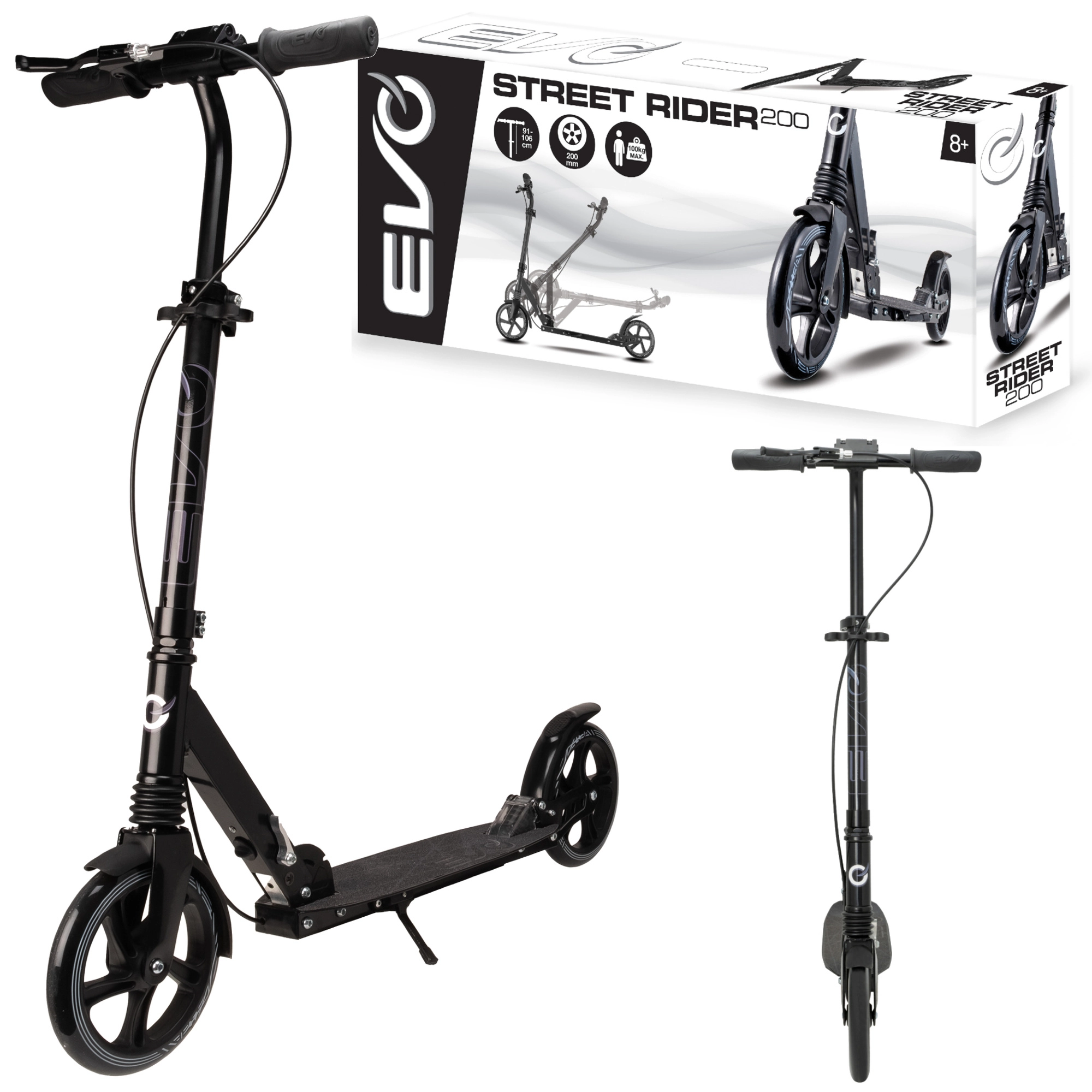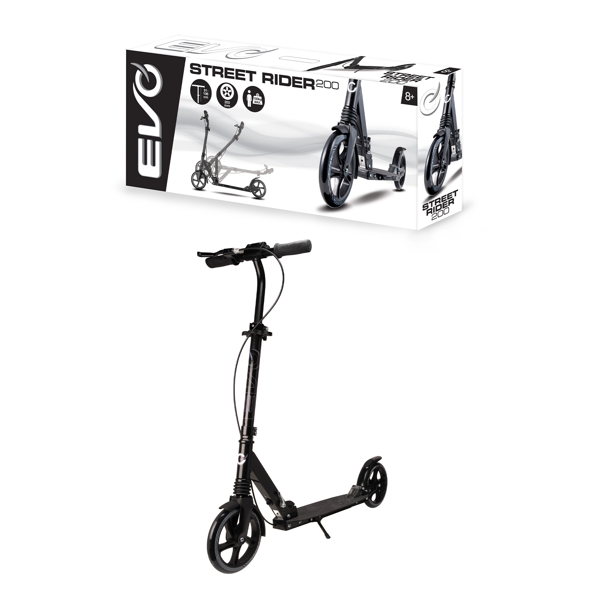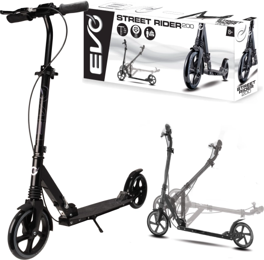 La trottinette EVO Street Rider 200 est un excellent choix pour les déplacements urbains comme pour les balades de loisir. Grâce aux grandes roues de 200 mm avec roulements ABEC-7, elle démarre facilement et roule en douceur; la suspension absorbe les irrégularités et la construction pliable assure un transport et un rangement aisés. La hauteur du guidon réglable s’adapte à la taille du rider, de sorte que la trottinette puisse accompagner l’enfant comme l’ado.