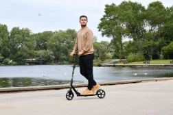 La trottinette se plie en un instant, se pose sur sa béquille et se transporte aisément grâce à la sangle réglable.