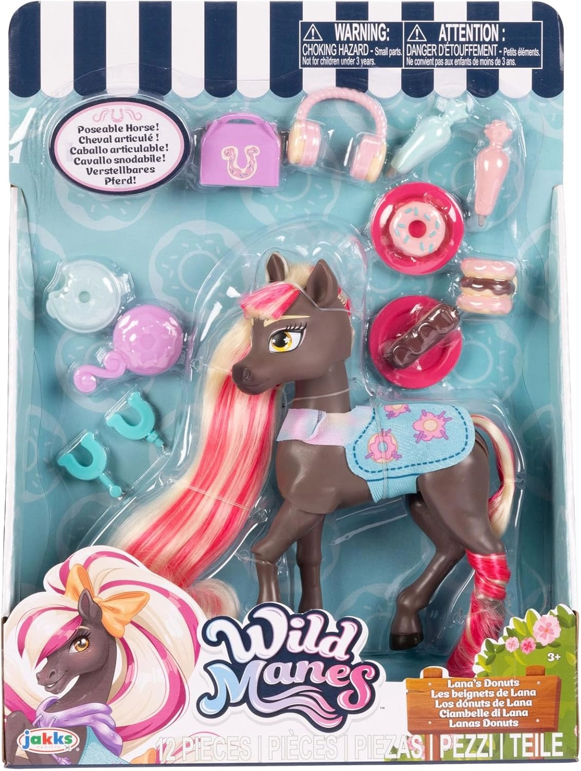 Adorable coffret mettant en scène l’héroïne cheval Lana de l’univers Wild Manes avec une crinière colorée à coiffer, des membres articulés et de nombreux accessoires pour cuire et décorer des donuts. Les enfants vont adorer créer des coiffures créatives, jouer des scènes de la ville de Mane Lane et s’adonner au jeu d’imagination avec 12 éléments dans de doux tons pastels.