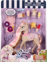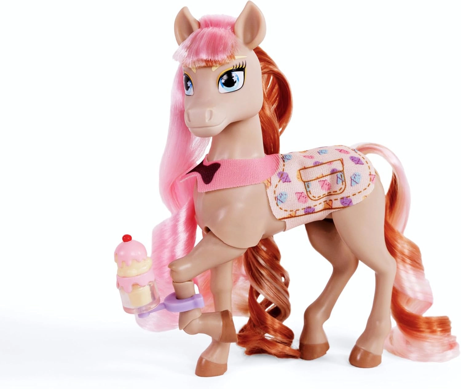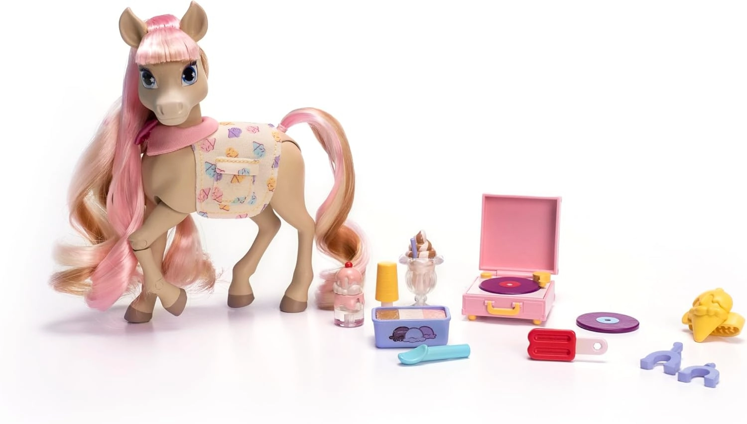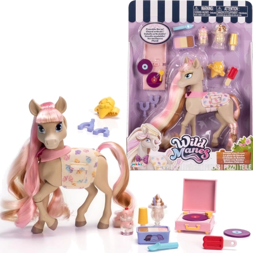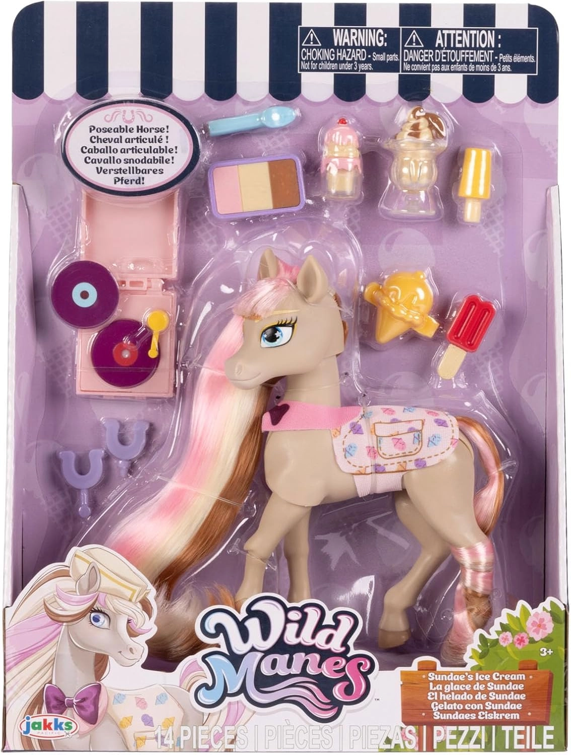 Le cheval Sundae séduit avec des mèches napolitaines et des tons pastel qui évoquent l’univers des douceurs. Grâce à ses pattes avant articulées, elle réussit des poses craquantes et le « service » de glaces gourmandes. Sa longue crinière appelle au brossage et à la décoration, tandis que les accessoires amusants ouvrent la porte à d’infinies saynètes dans la ville de Mane Lane de la série WILD MANES.