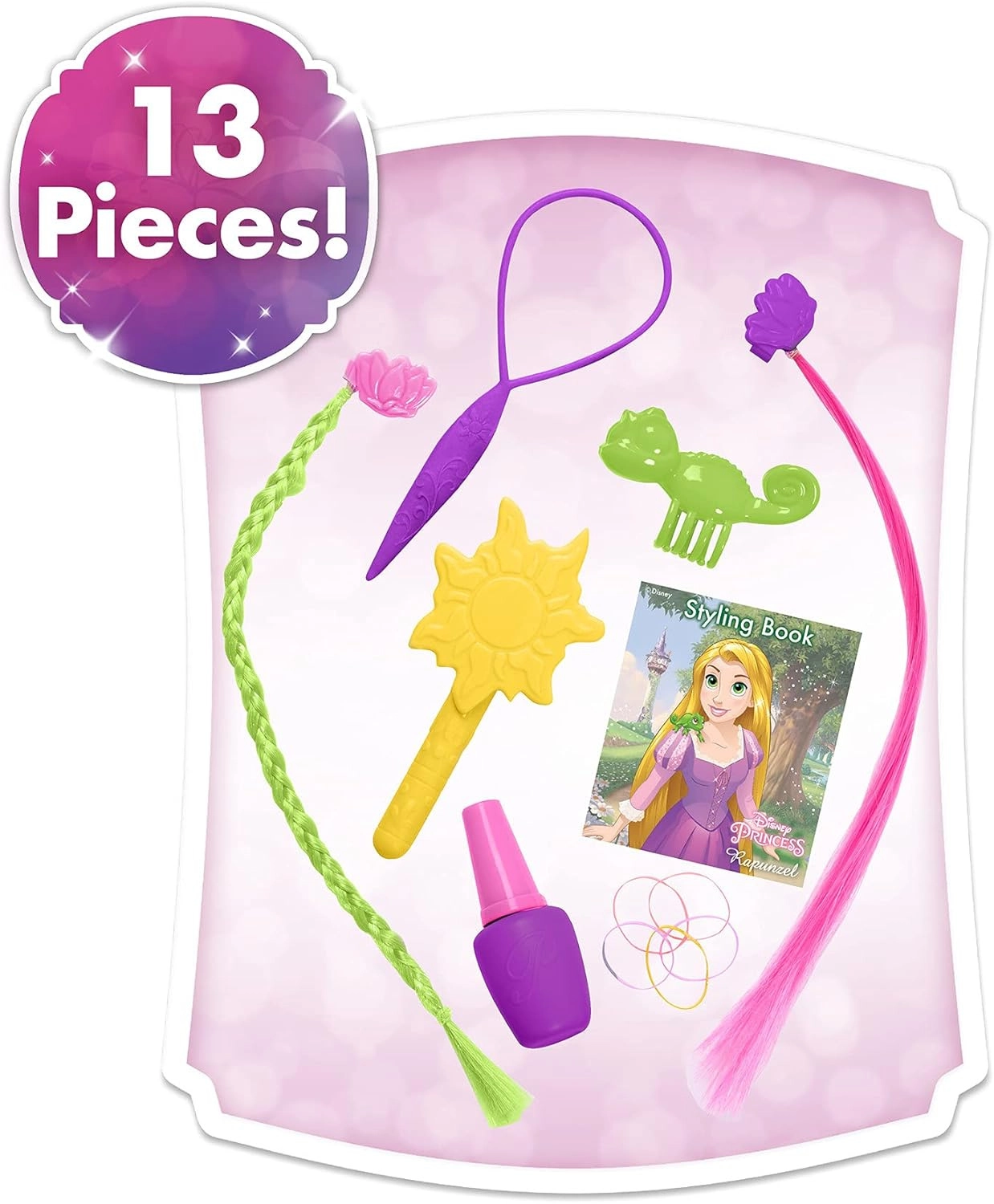 Le set comprend une collection de 13 pièces d’outils pratiques : brosse, outil de création de coiffures, élastiques colorés, clips à mèches, barrettes thématiques et un petit livre d’idées pour une inspiration rapide. Les accessoires peuvent être utilisés aussi bien sur la tête de Raiponce que dans les cheveux de l’enfant.