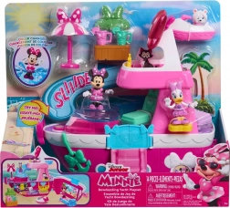 Le set comprend les figurines MINNIE, DAISY et le mignon chien Snowpuff, à installer sur les fauteuils, la balançoire ou à faire glisser sur le toboggan. Lumières et sons ainsi qu’une « boule disco » scintillante donnent une atmosphère magique à chaque scène, tandis que l’eau froide dans la piscine active le changement de couleur magique.