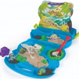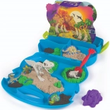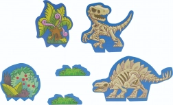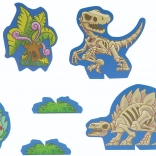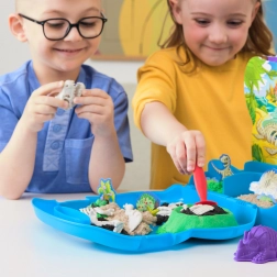 Le set développe la motricité fine, l’imagination et la sensorialité. La boîte contient de nombreux accessoires : squelette en plastique, moules, outil pour creuser, figurines en carton de plantes et de dinosaures, ainsi qu’un décor coloré pour créer un mini monde de dinosaures.
