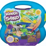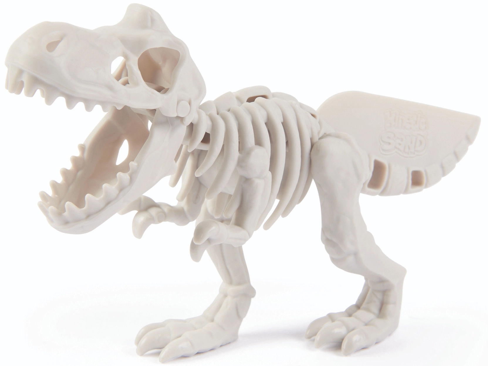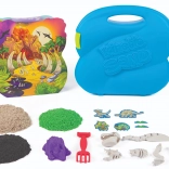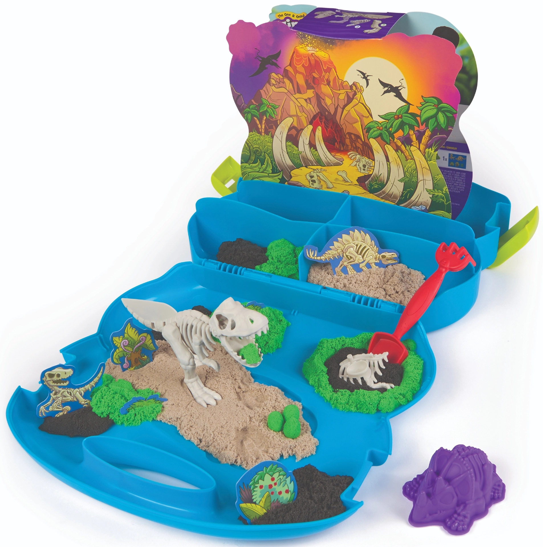 - Sable cinétique, squelette de T‑Rex, moules et outils, figurines et décors en carton, bac portable