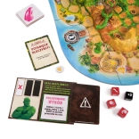 4 bords de plateau, 2 pièces d’île 3D, 34 jetons, 4 figurines de joueurs, 1 figurine de méchant, 6 tuiles d’amélioration, 4 plateaux de joueur, 20 cartes, 1 pont, 4 dés, 1 arbre à serpents, 1 corne de cristal, 1 boule d’acier, 1 Montagne du Rhinocéros, 1 babouin, 1 arbre à babouin, 1 guépard, 1 lanceur de guépard, 2 billes en plastique, règles