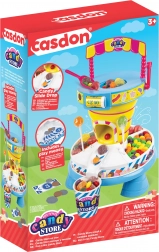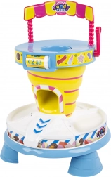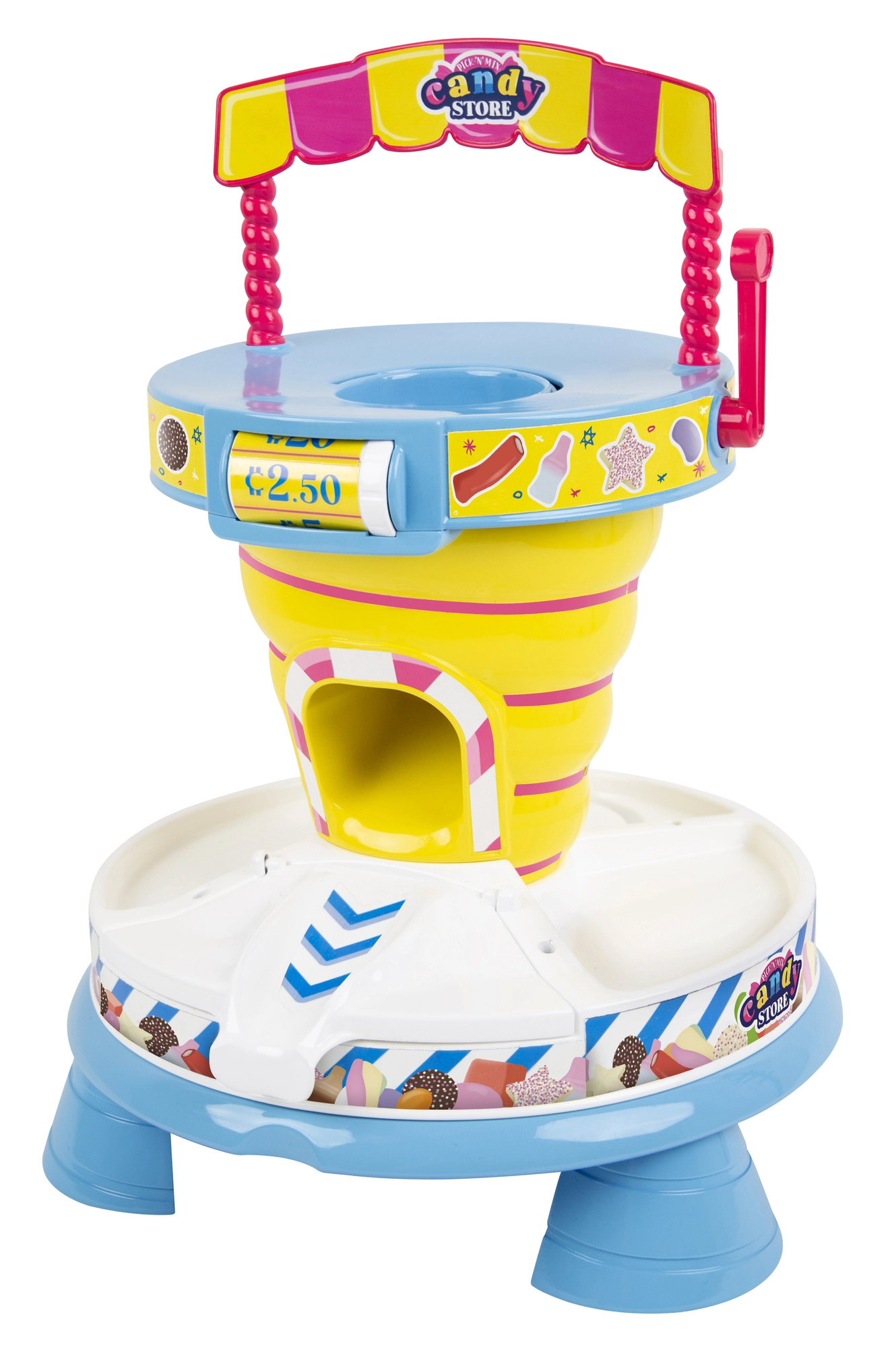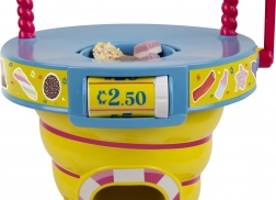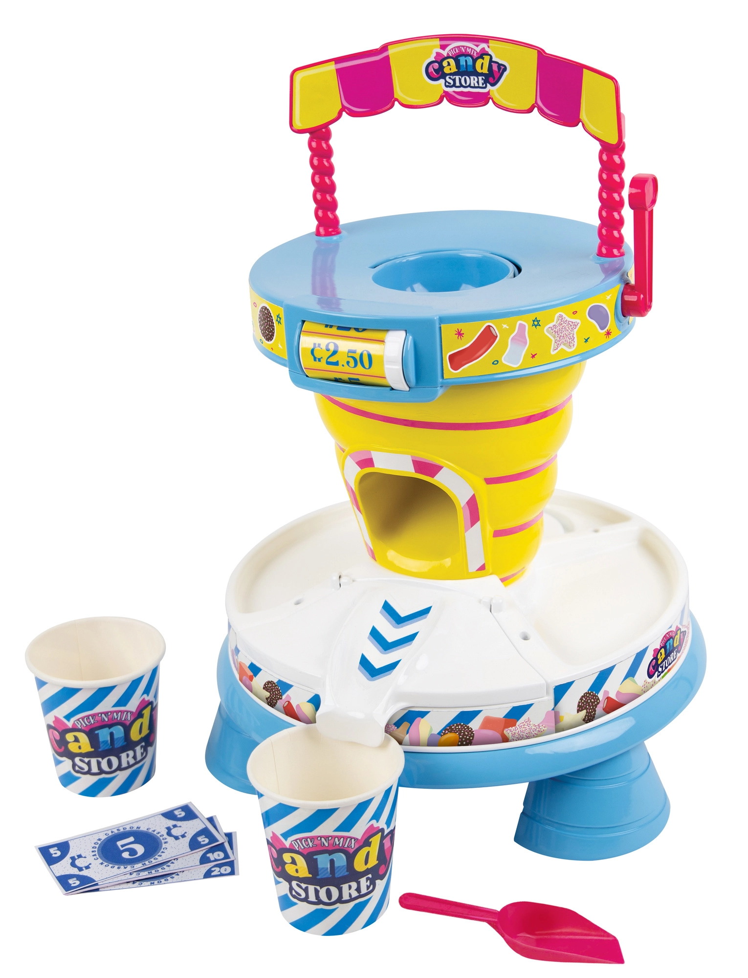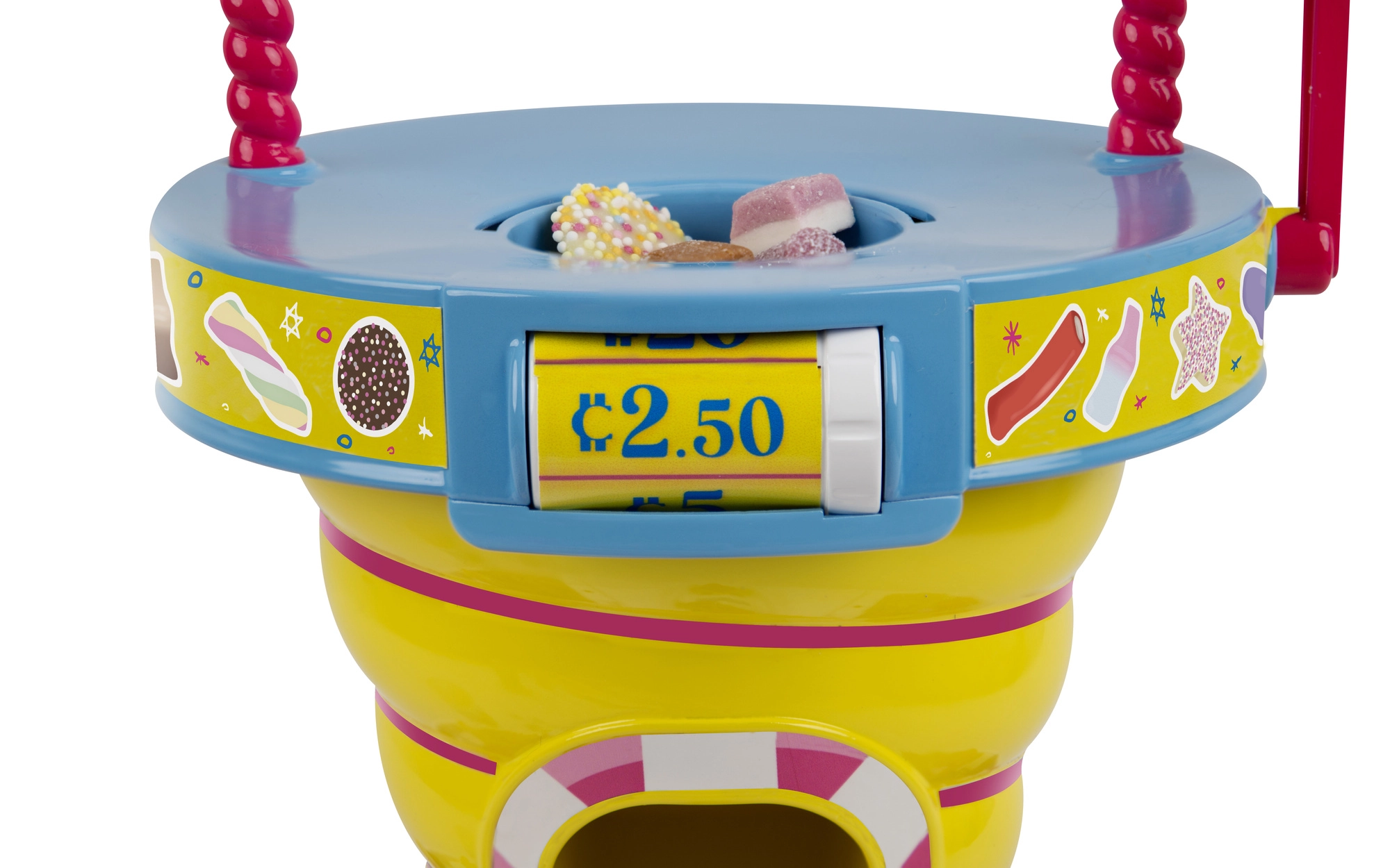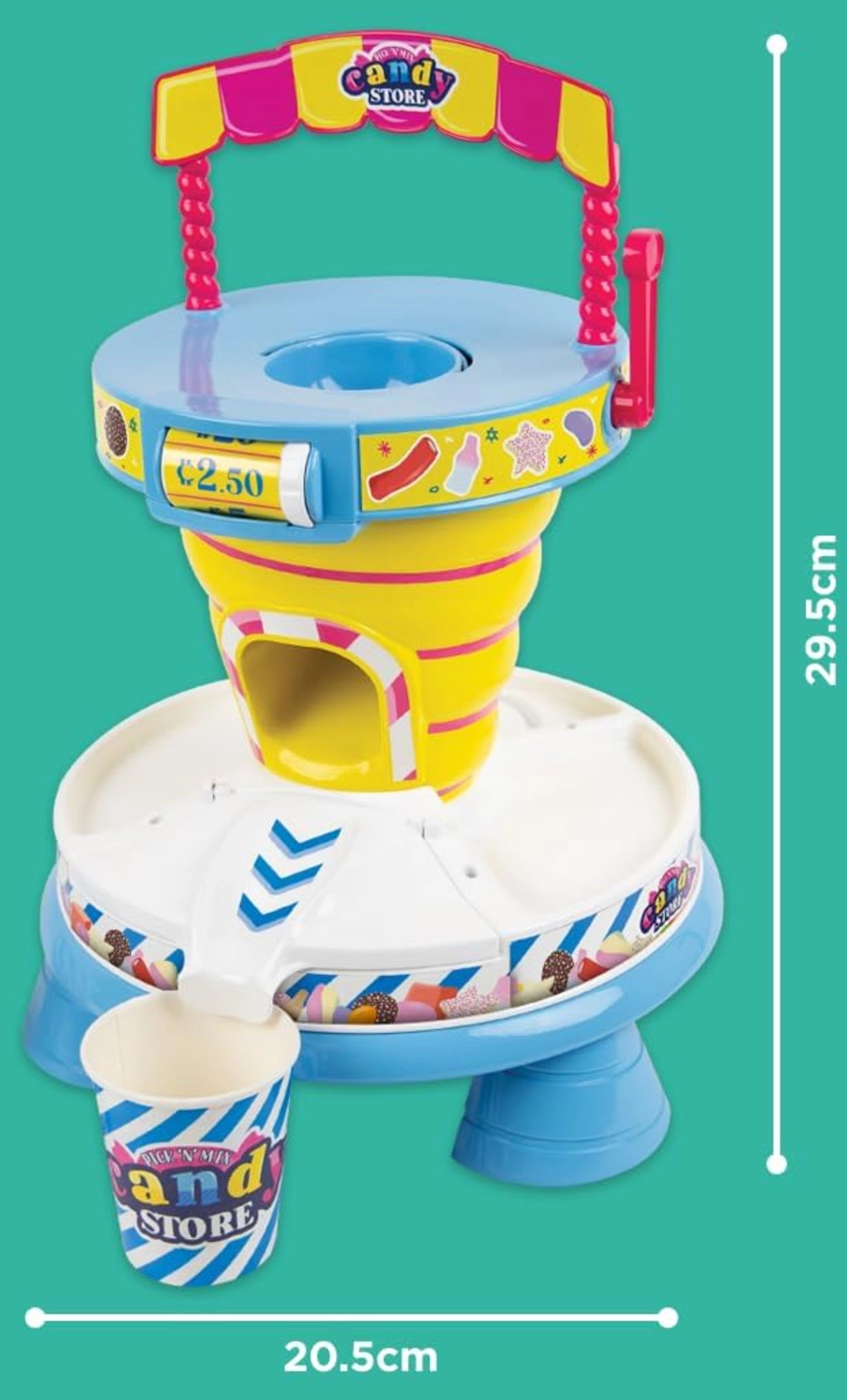 Grand entonnoir, manivelle et goulotte pour verser dans les gobelets font du service en confiserie un jeu d’adresse attrayant qui entraîne la motricité fine.