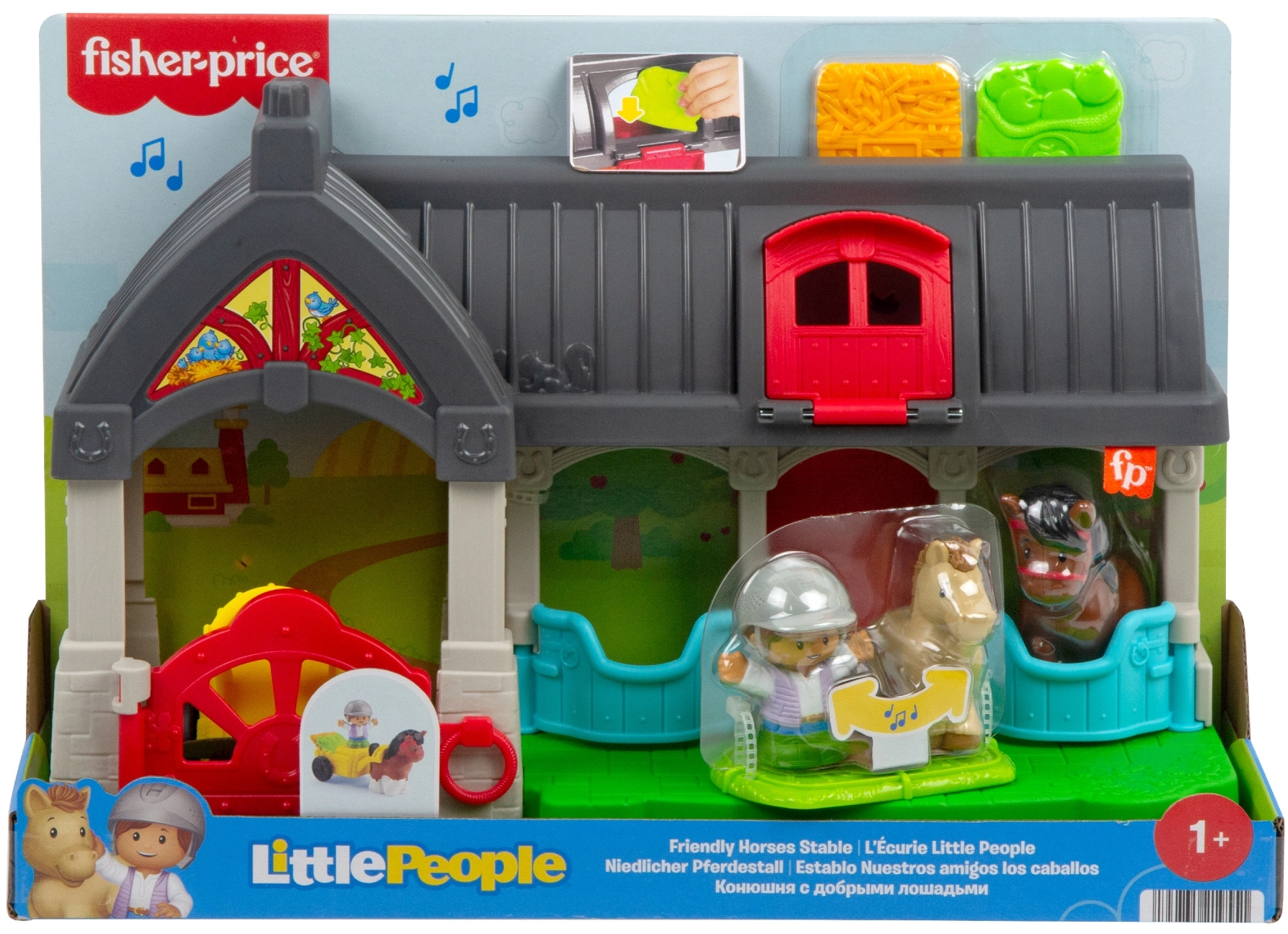 L’adorable étable Little People met le monde des animaux à portée de main. Deux zones distinctes à explorer, des portes de boxes ouvrantes et une ouverture spéciale pour « nourrir » transforment chaque session de jeu en une nouvelle histoire. Les enfants peuvent atteler le plus grand cheval à la remorque, transporter le « foin » et s’occuper de leurs chevaux avec l’aide de la figurine du soigneur.