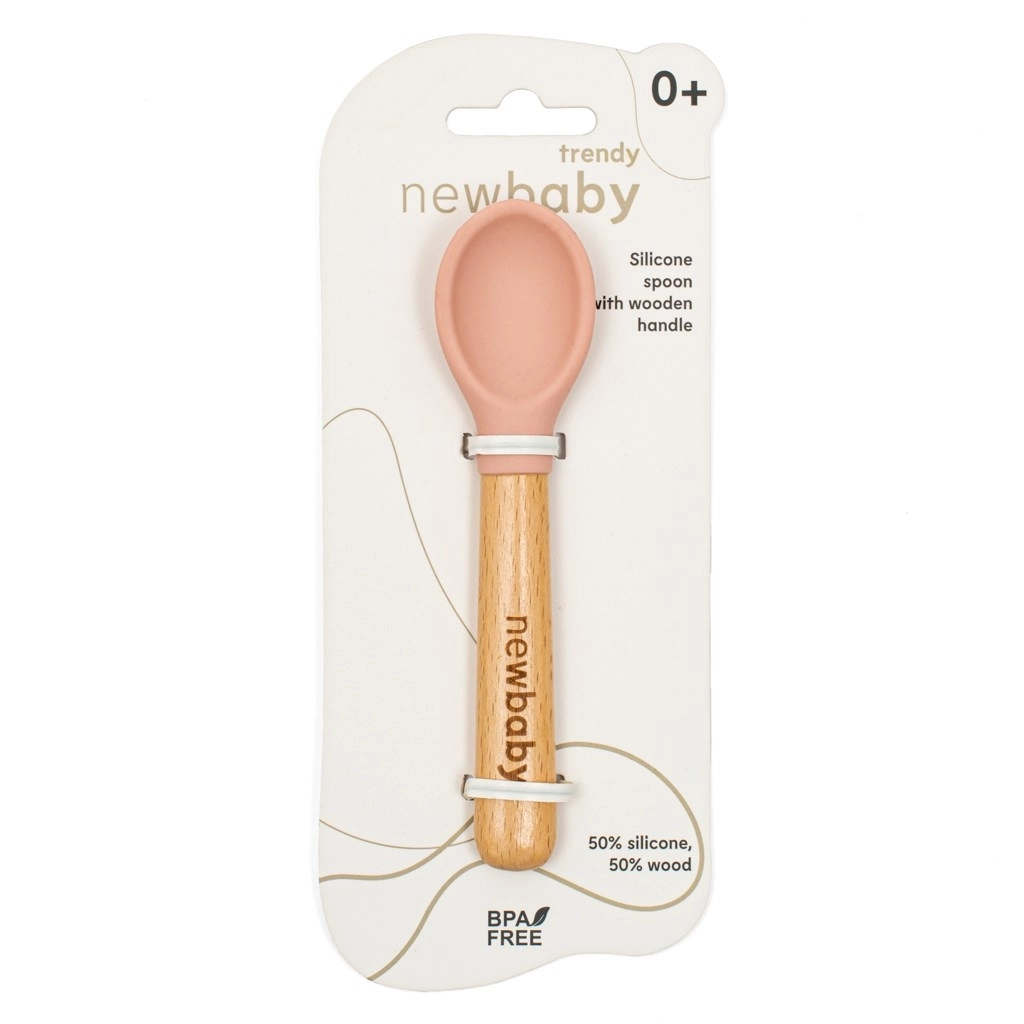 Découvrez l’alliance du design moderne et de la fonctionnalité. La cuillère en silicone pour enfants NEW BABY, de couleur rose, est fabriquée en silicone de la plus haute qualité, sans BPA et complétée par un manche en bois avec une gravure élégante. Grâce à sa surface douce, elle est délicate pour les gencives sensibles et confortable pour une utilisation quotidienne.