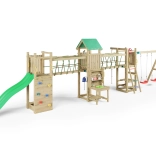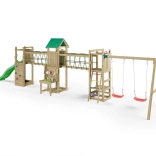 L’aire de jeu est conçue pour de longues heures d’amusement actif en plein air. La tour en bois avec toit offre ombre et confort, le pont de corde entraîne la coordination et le mur d’escalade avec prises et corde développe force et agilité. Le toboggan de 2,2 m garantit des descentes rapides, tandis que les deux balançoires raviront les enfants de tout âge.