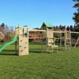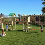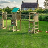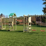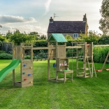 - Toboggan 220 cm (vert), pont de corde, mur d’escalade avec corde et 6 prises, 2 balançoires, module cuisine avec « évier », gouvernail, télescope, cloche, téléphone