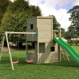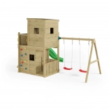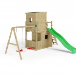 L’aire FUNGOO Lofter combine une structure en bois stable avec un riche équipement pour un divertissement polyvalent : maisonnette surélevée avec toit et petite porte, toboggan ondulé de 2,9 m, mur d’escalade avec prises, montée confortable par des marches et portique avec deux balançoires. Grâce à des assemblages de qualité, des poignées de sécurité et des éléments d’ancrage, l’ensemble est solidement fixé et prêt pour une utilisation quotidienne.