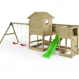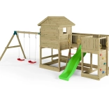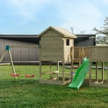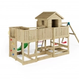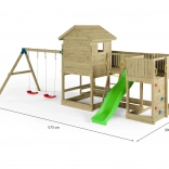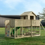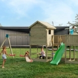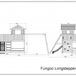 Fungoo Longstepper est une aire de jeux complète en bois de qualité, imprégné sous pression, conçue pour durer et pour une utilisation quotidienne. Grâce à une disposition bien pensée des éléments, elle développe la motricité, l’équilibre et l’imagination des enfants. Des poignées, des garde-corps et des assemblages métalliques solides renforcent la sécurité.