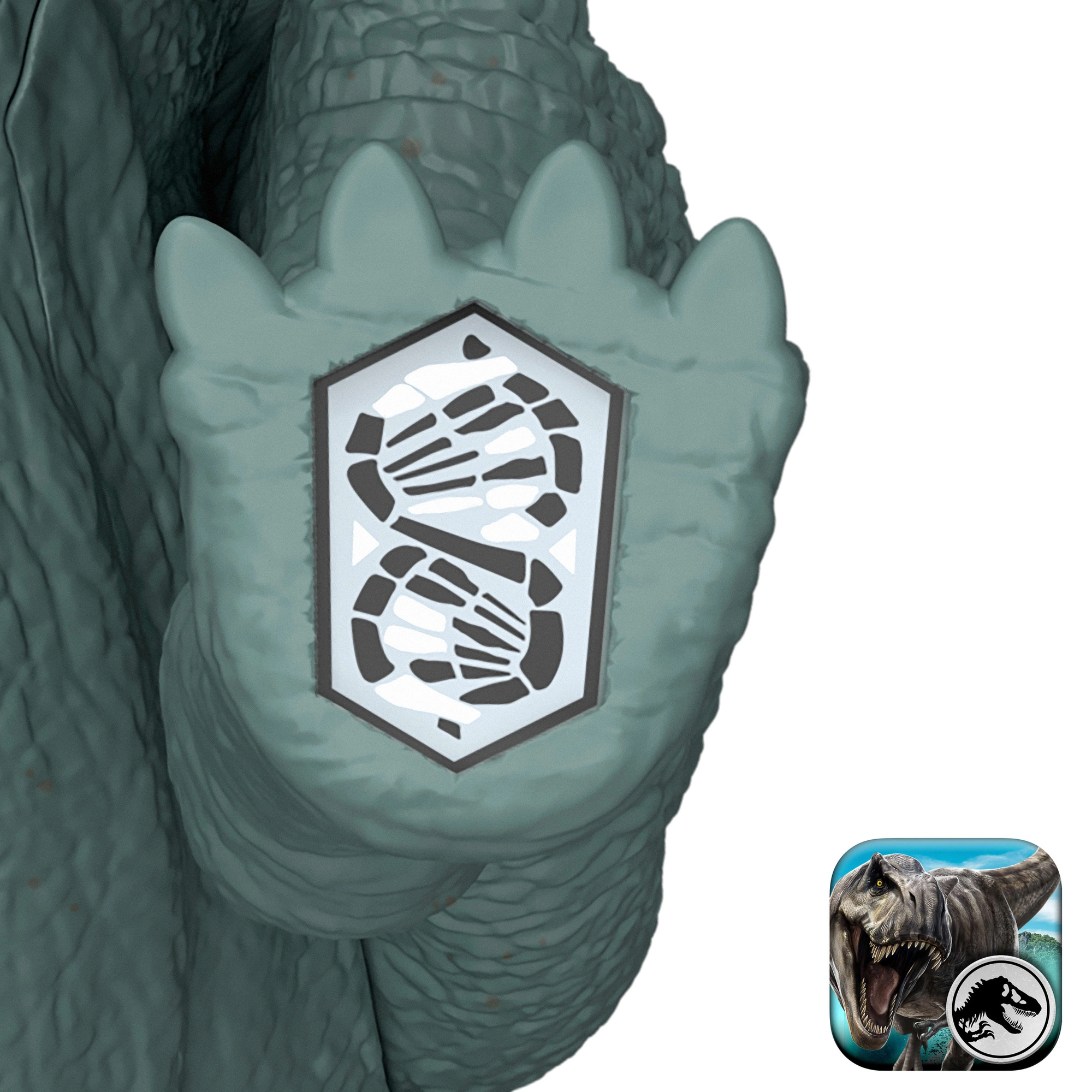 Le code ADN caché sur la patte de la figurine peut être scanné dans l’application gratuite Jurassic World Reborn: Facts (Android/iOS). En AR, explorez un modèle squelettique en mode radiographie, une vue thermique ainsi que du contenu éducatif, et profitez de mini-jeux comme des courses avec des dinosaures ou la recherche de fossiles.