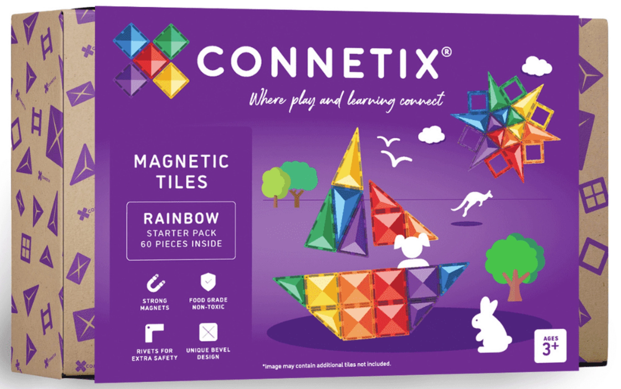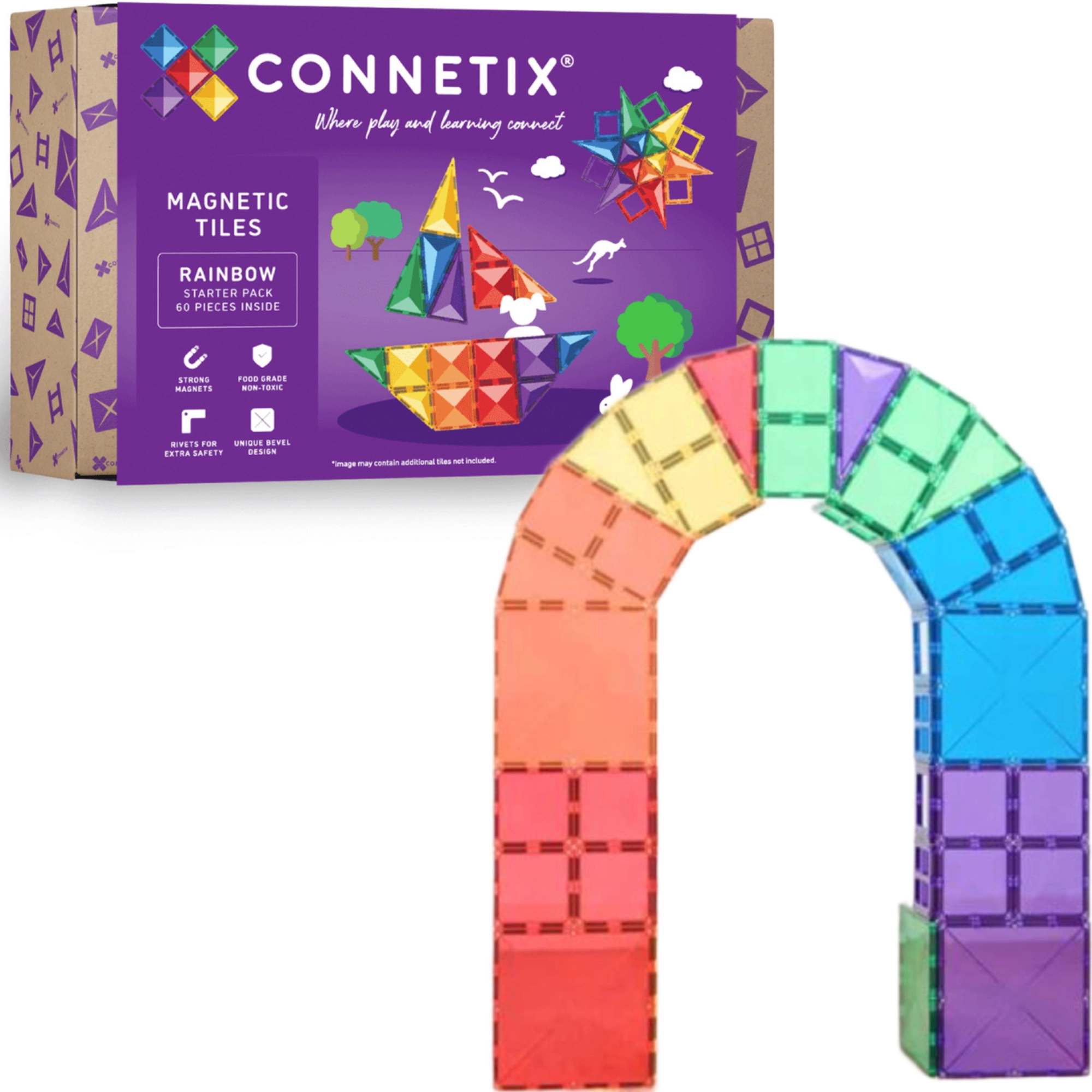 Le CONNETIX Rainbow Starter Pack apporte 60 tuiles magnétiques de qualité, translucides, aux couleurs intenses, avec bords arrondis et de très puissants aimants en néodyme pour des structures stables. Les enfants adorent le « clic » caractéristique lors de l’assemblage, tout en développant naturellement les mathématiques, la physique, la technologie et l’art.