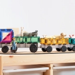 Trois châssis à roues transforment le set en voitures, trains ou fusées. Les enfants construisent, reconstruisent et explorent le mouvement et la stabilité des structures en pratique.