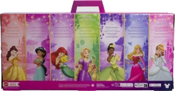 Ce coffret généreux réunit les héroïnes préférées : ARIEL, AURORA, BELLE, CENDRILLON, JASMINE, RAIPONCE et TIANA. Chaque poupée séduit par des détails caractéristiques inspirés des films, des tissus scintillants et des accessoires élégants. Les hauteurs variées et les bras et jambes articulés permettent de poser facilement les poupées et de raconter ses propres histoires.