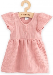 Légère et confortable, la robe en mousseline pour enfants New Baby de couleur rose est idéale pour l’été. Elle possède une coupe trapèze, des manches courtes, une jupe délicatement froncée et une fermeture pratique à l’avant pour un habillage facile. Fabriquée en 100 % coton certifié OEKO-TEX STANDARD 100 – douce pour la peau des enfants, respirante et moelleuse au toucher.