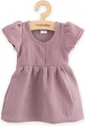Des robes en mousseline pour enfants New Baby, légères et respirantes, en coloris lavande, feront le bonheur de toutes les petites coquettes. Elles ont une coupe trapèze confortable, des manches courtes et une fermeture pratique sur le devant pour un habillage facile. En mousseline de haute qualité 100 % coton, certifiée OEKO-TEX STANDARD 100, elles sont douces et délicates, idéales pour l’été.