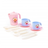 - 1× théière avec couvercle, 2× tasse, 2× assiette, 2× couteau, 2× fourchette, 2× cuillère
