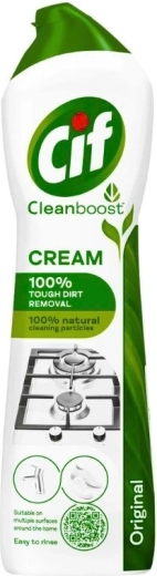 Le nettoyant crémé Cif crème à récurer liquide Original avec la technologie Cleanboost et des particules nettoyantes d’origine naturelle élimine efficacement la saleté tenace, la graisse et les dépôts, tout en étant douce pour les surfaces. Idéal pour les cuisines, les salles de bains, les éviers, les cuisinières et les carrelages.