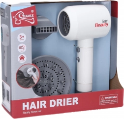Le jouet est conçu pour un amusement sûr à la maison – il comporte un bouton on/off et un bouton décoratif sans fonction. Le sèche‑cheveux est alimenté par 1× pile AA (non fournie), ce qui permet de l’emporter facilement partout.