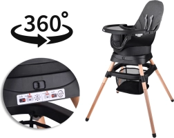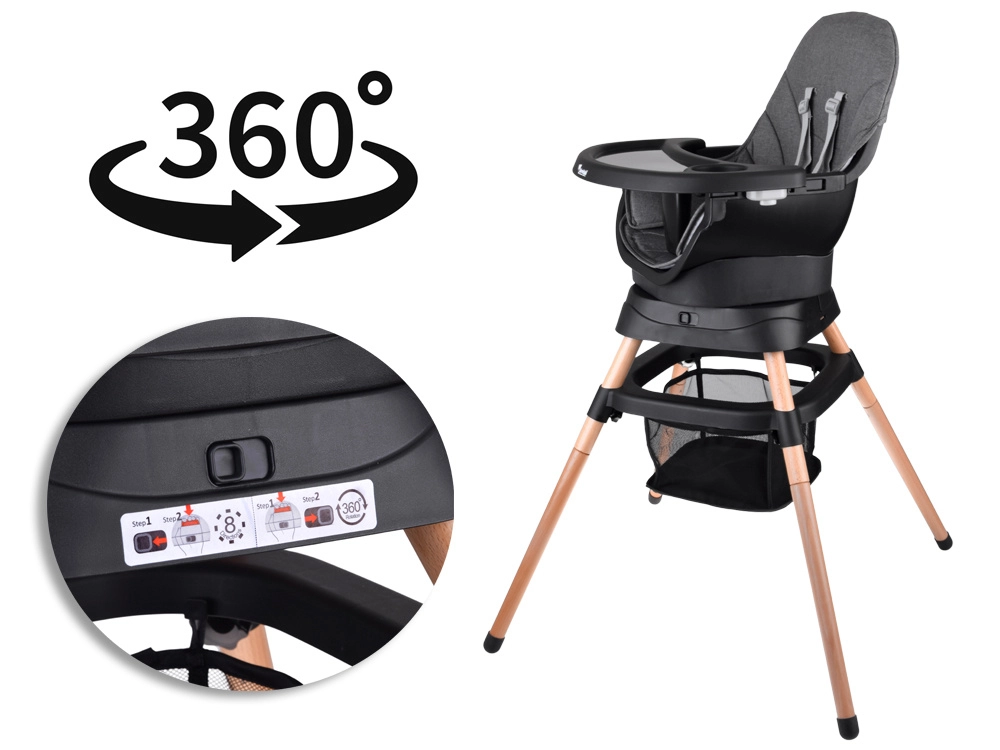 La chaise multifonction 6-en-1 combine confort, sécurité et praticité en une seule solution. Grâce à sa conception modulaire bien pensée, elle se transforme aisément en chaise haute, chaise basse avec plateau, petit fauteuil indépendant, rehausseur pour chaise de table, tabouret haut ou tabouret bas. Le siège pivotant à 360° avec 8 positions de verrouillage garantit un réglage idéal pour le repas comme pour le jeu.