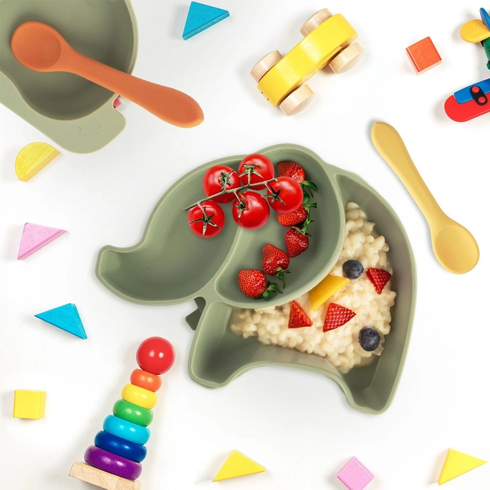 Pratique assiette pour enfant en forme d’éléphant, en silicone, avec trois compartiments et une ventouse puissante pour des repas stables et sans dégâts. Résiste aux variations de température, compatible lave-vaisselle, micro-ondes et congélateur. Ventouse antidérapante, 3 sections séparées, silicone sûr et nettoyage facile facilitent chaque repas.