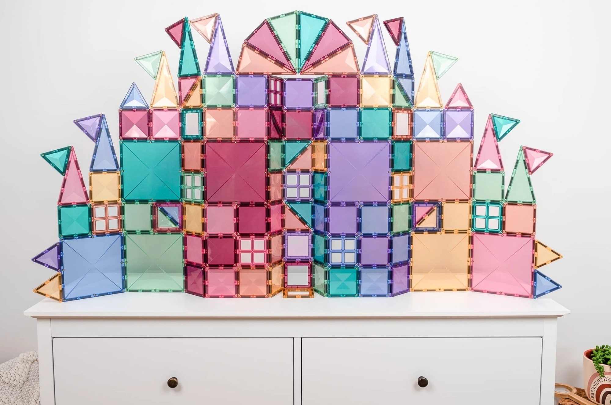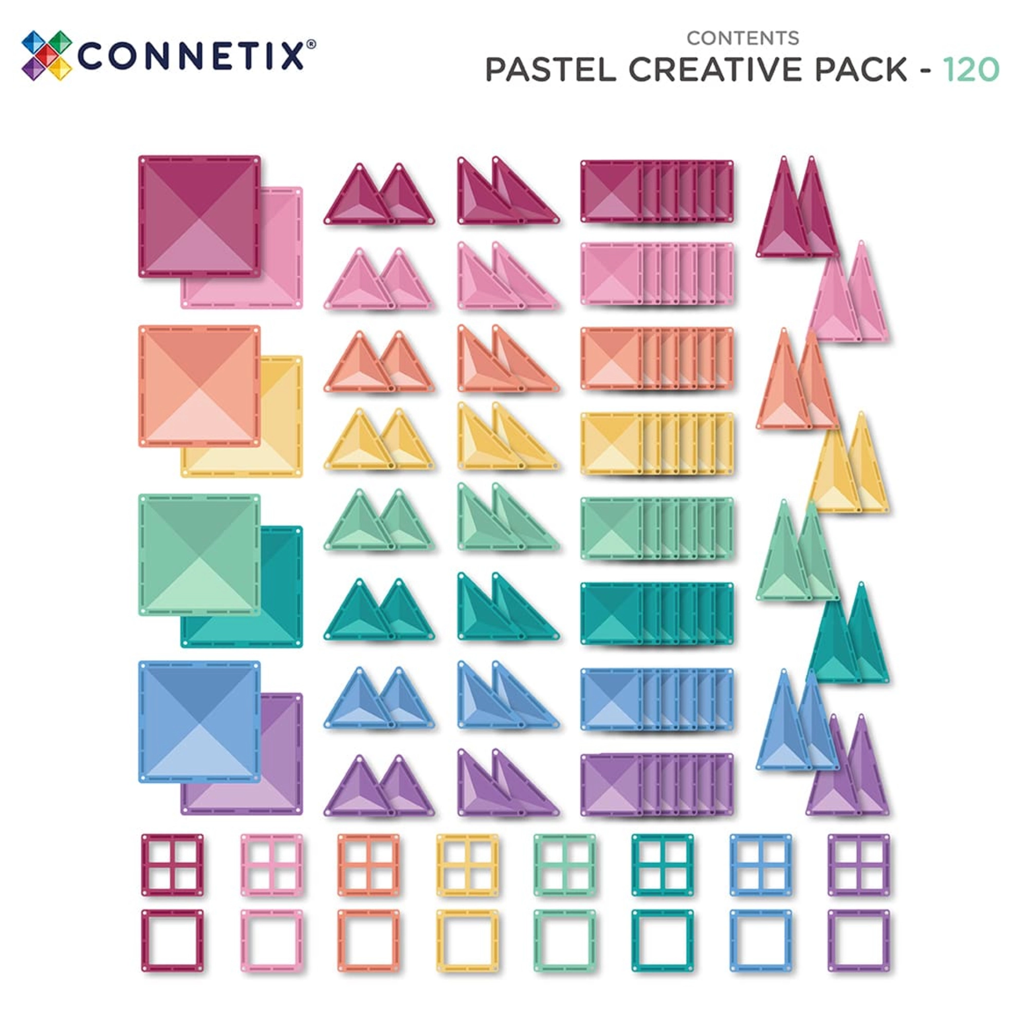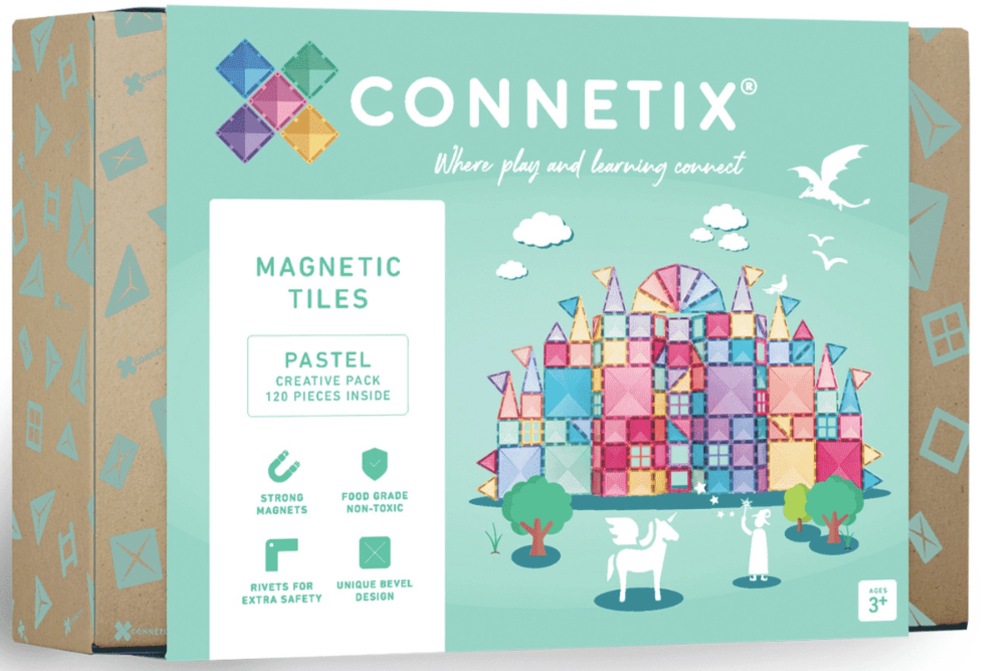 Le set CONNETIX Pastel Creative Pack propose 120 tuiles magnétiques transparentes aux couleurs pastel douces pour créer châteaux, ponts et tours futuristes. Grâce aux aimants en néodyme puissants, les pièces s’attirent de chaque côté et forment des constructions stables qui soutiennent les compétences STEM/STEAM – de la physique du magnétisme à la géométrie spatiale.