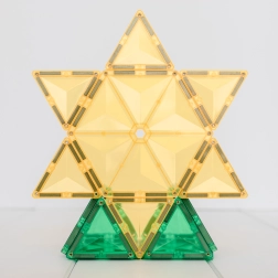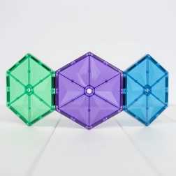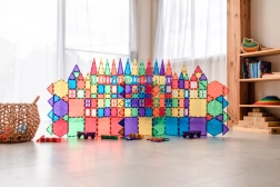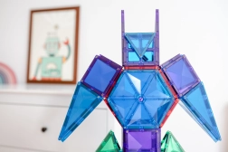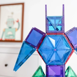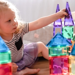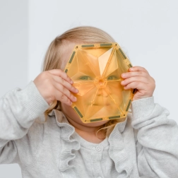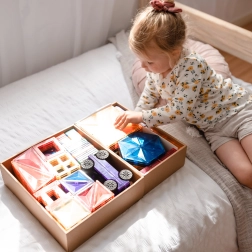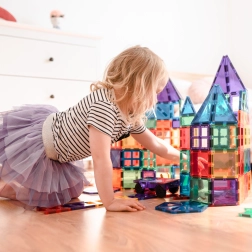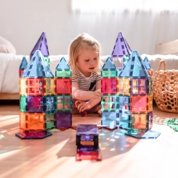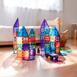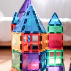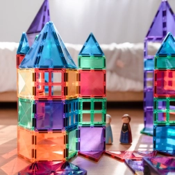 Les tuiles magnétiques transparentes aux couleurs vives permettent aux enfants de créer de hautes tours, châteaux et maisons, et d’explorer le monde des lumières et des ombres en jouant près d’une fenêtre ou avec une lampe.