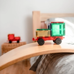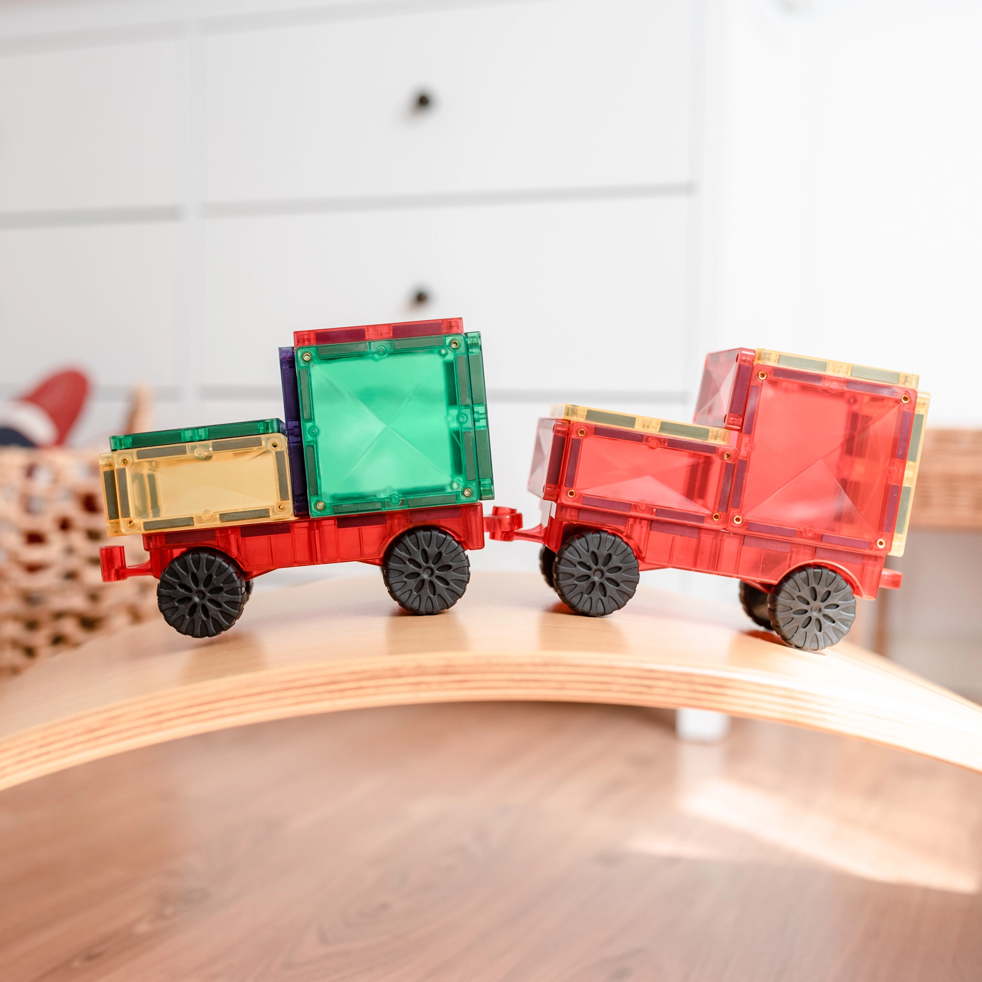 Deux châssis à roues transforment le set en un jeu dynamique – du camion au petit train. Construisez, connectez et partez à l’aventure.
