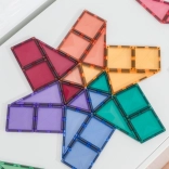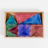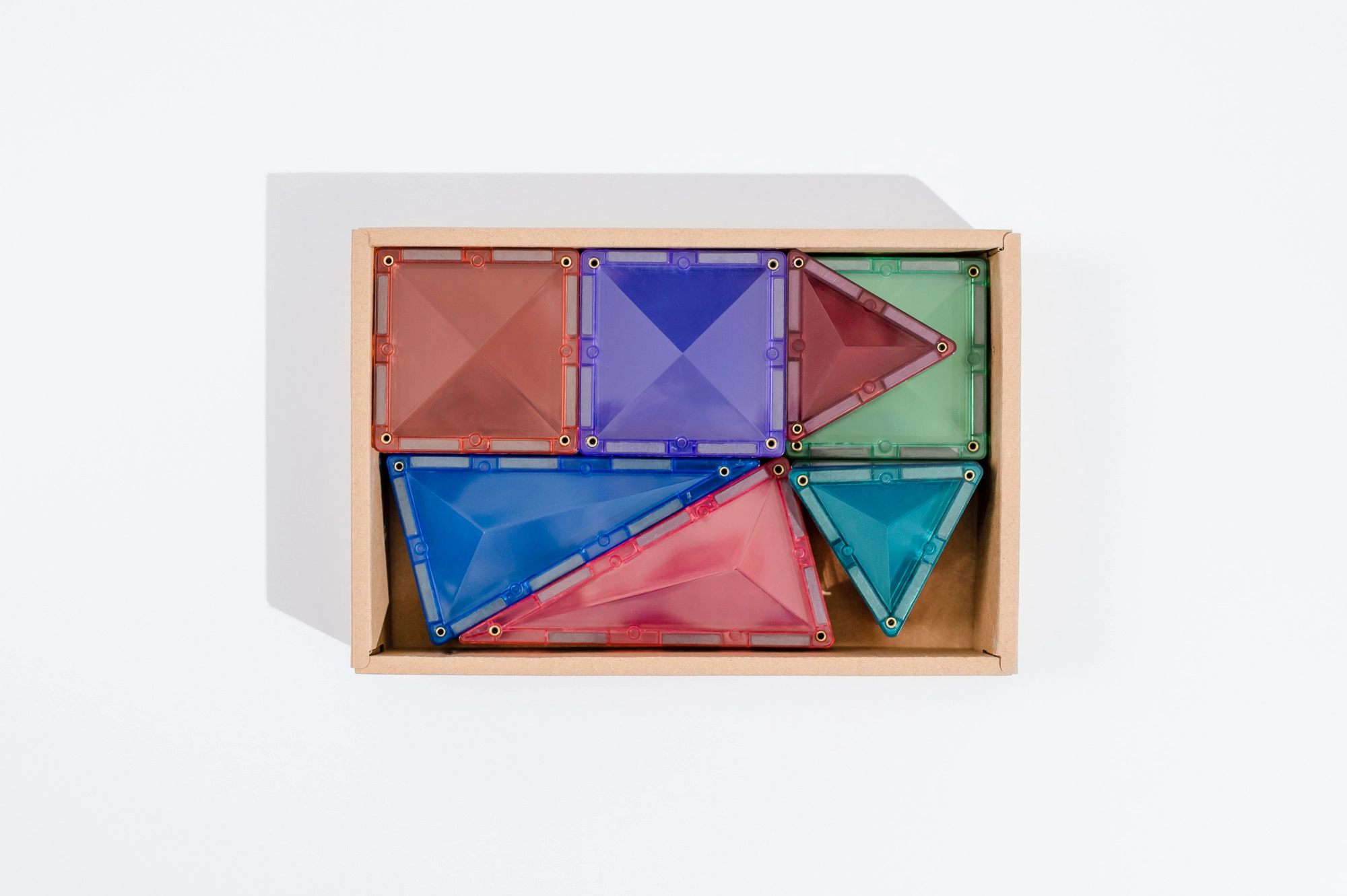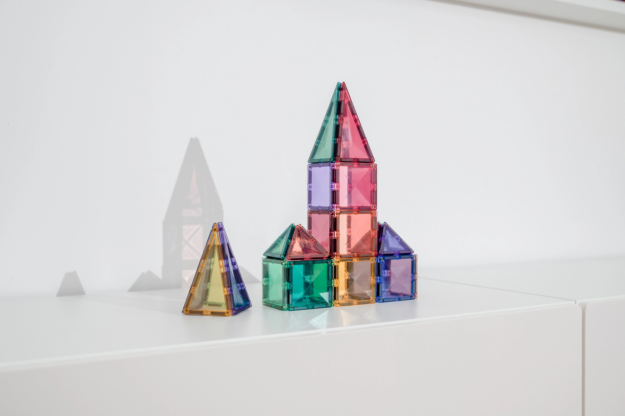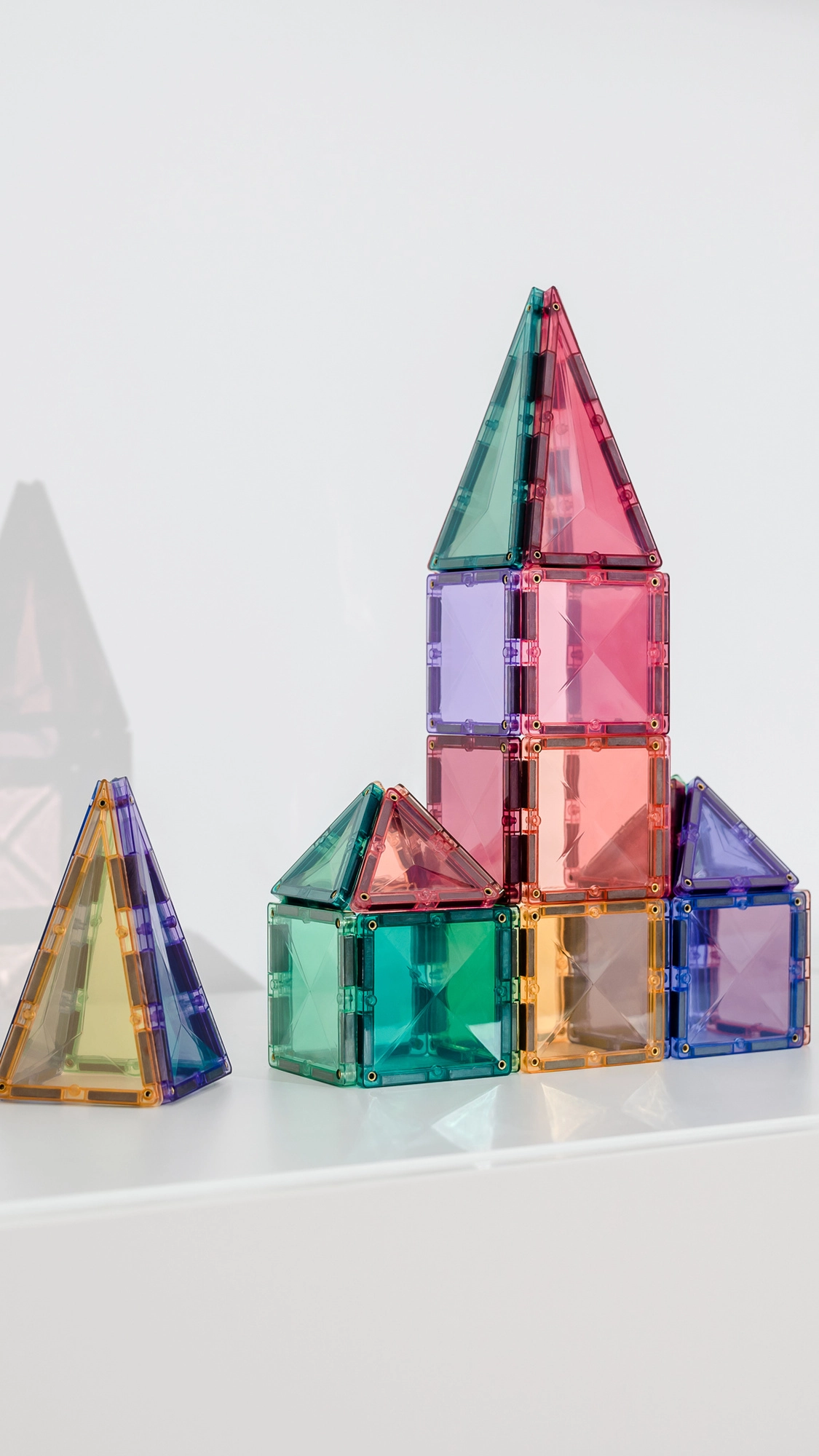 Le set comprend 16 petits carrés, 8 triangles équilatéraux et 8 triangles isocèles, ainsi qu’un livret illustré d’inspirations. Compatible avec les autres sets CONNETIX, il permet d’agrandir les constructions à l’infini. Les couleurs transparentes laissent magnifiquement passer la lumière et encouragent le jeu sensoriel.
