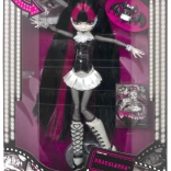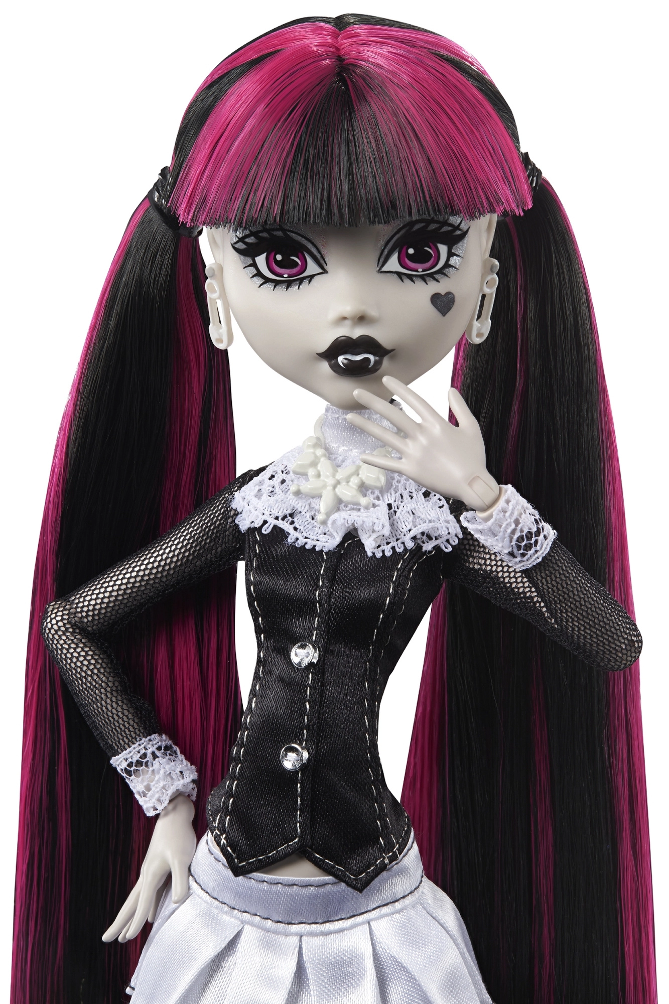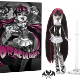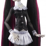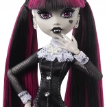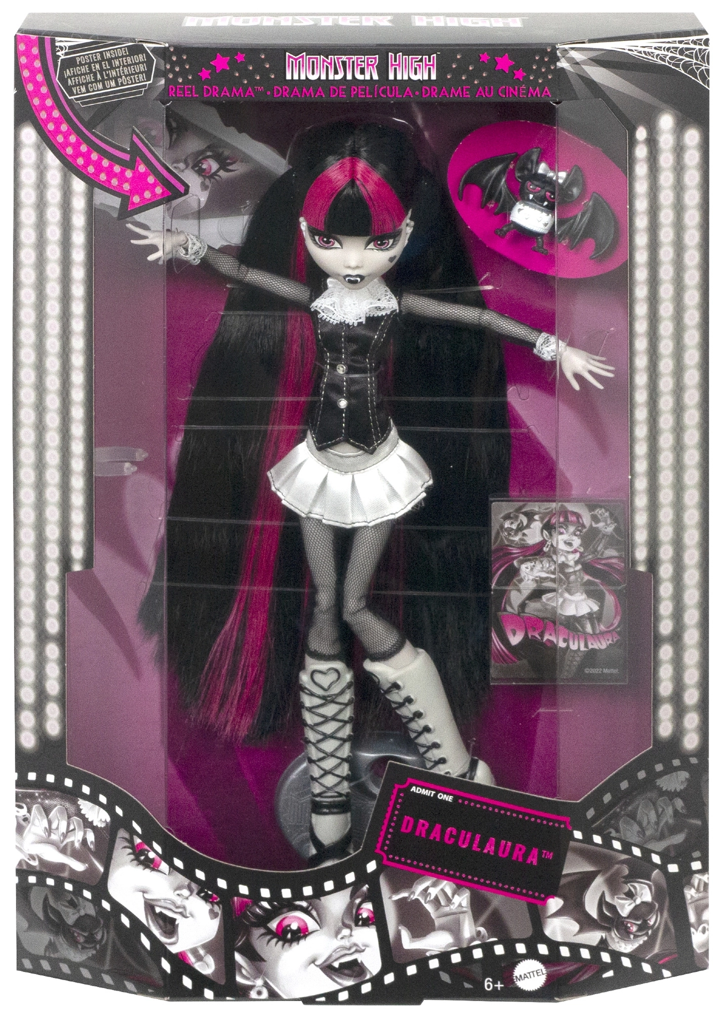 Draculaura de l’édition Reel Drama rend hommage aux classiques du cinéma – un style contrasté noir et blanc avec des accents roses, de longs cheveux noirs aux mèches roses et un maquillage gothique créent un look affirmé qui ravira fans et collectionneurs. Grâce à sa pleine articulation, elle est idéale pour jouer, photographier et exposer sur son support.